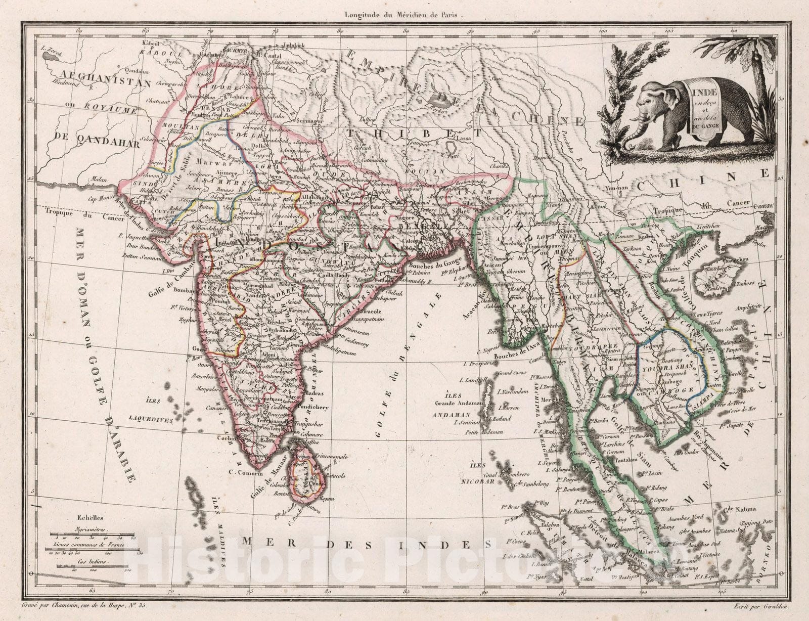 Inde en deca et au de la du Gange. | Atlas Complet Du Precis De La Geographie Universelle De M. Malte-Brun; Dresse Conformement Au Texte De Cet Ouvrage Et Sous Les Yeux De L'Auteur, Par M. Lapie, Capitaine Ingenieur Geographe. (Cet Atlas est forme de 75 Cartes.) A Paris, Chez Francois Buisson, Libraire-Editeur, Rue Gilles-Coeur, No. 10. 1812. | These maps have beautiful cartouches and hand painted outline color. Lapie made the maps. 1st edition. This atlas is up to date: the North America map shows the Lewis and Clark information and Lewis and Clark are discussed in the text explaining the map. In French. Relief shown in hachures or sketches. Extraordinary unique vignettes used for framing the title of each map.