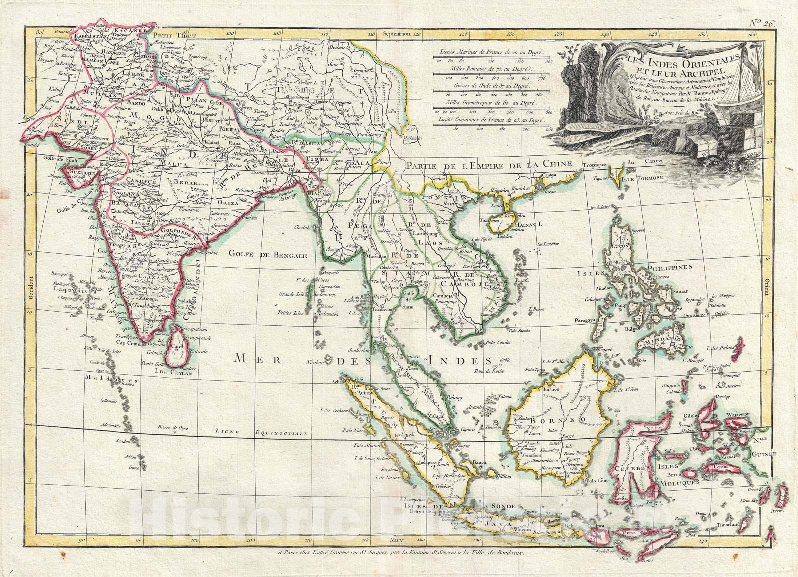 Historic Map : India, Southeast Asia and The East Indies "Thailand, Borneo, Singapore", Bonne, 1783, Vintage Wall Art