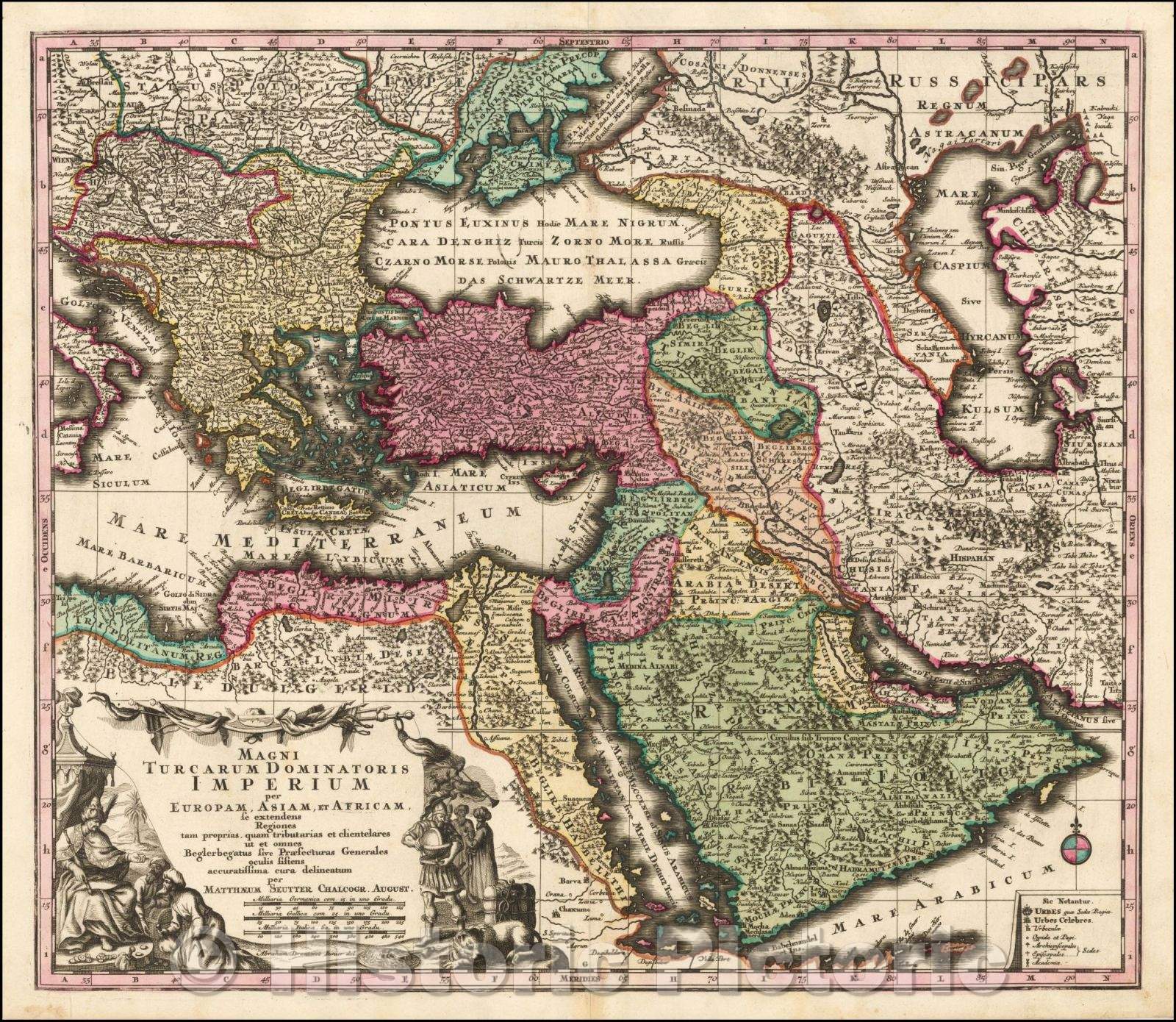 • .Historic Map - Magni Turcarum Dominatoris Imperium per Europam, Asiam, et Africam se extendens Regiones tam proprias quam tributarias et clientelares, 1727 - Vintage Wall Art