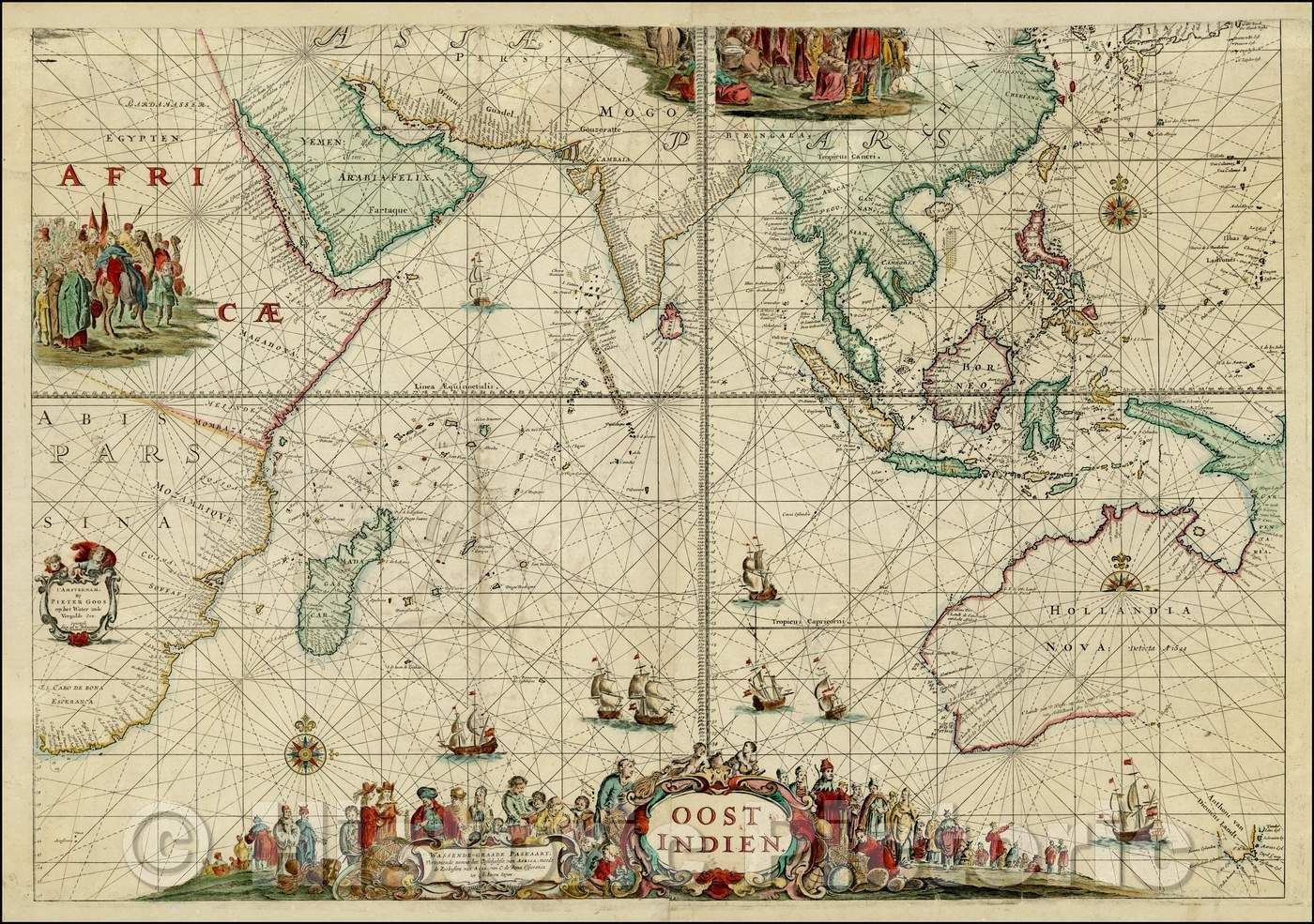 Historic Map - Oost Indien Wassende-Graade Paskaart, vertoonende nevens het Oosterlykste van Afrika, meede de Zeekusten van Asia, van C. de Bona Esperance tot Eso, 1690 - Vintage Wall Art