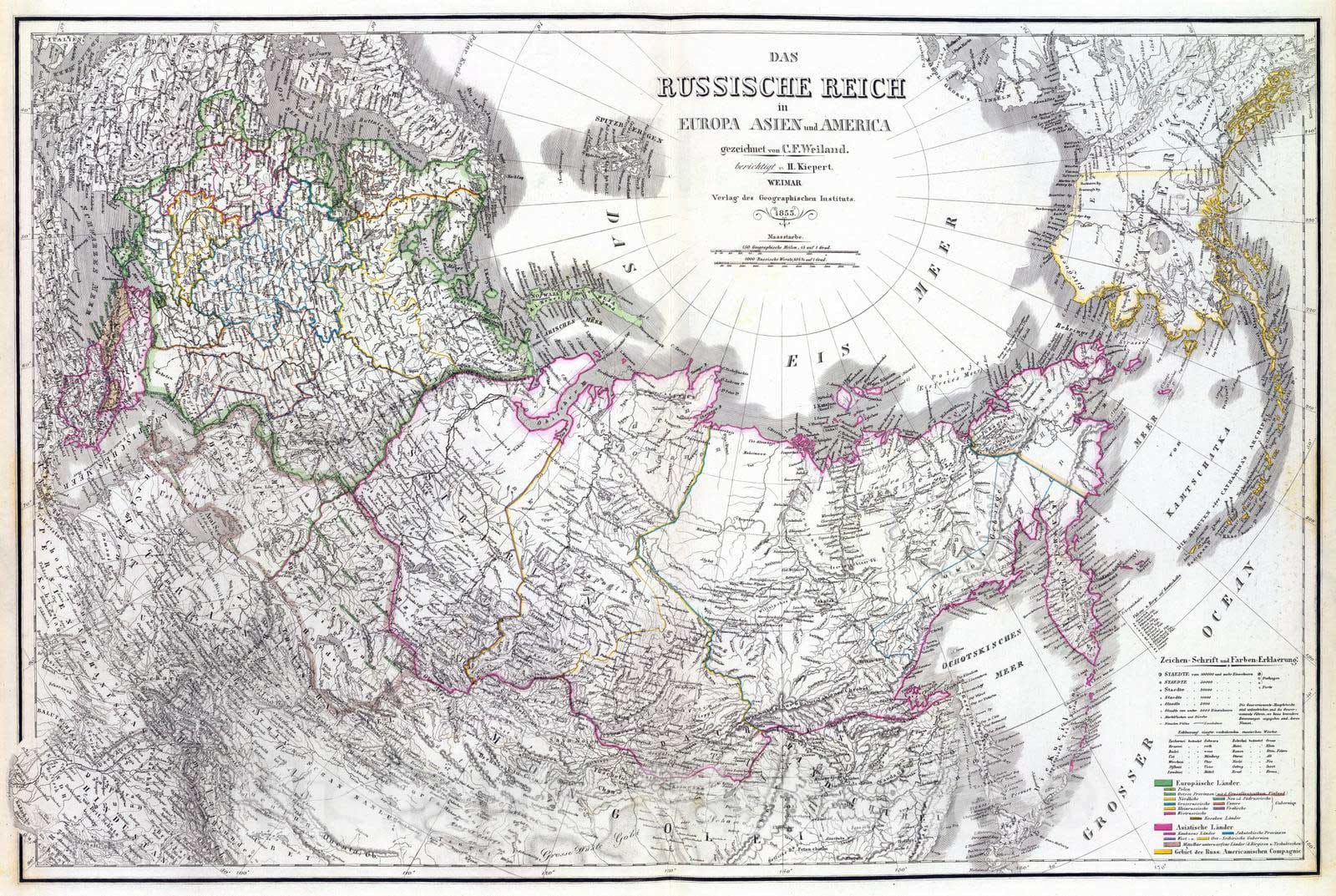 Historic Map : Russia, Alaska, , Asia; Europe 1855 Russische Reich. , Vintage Wall Art
