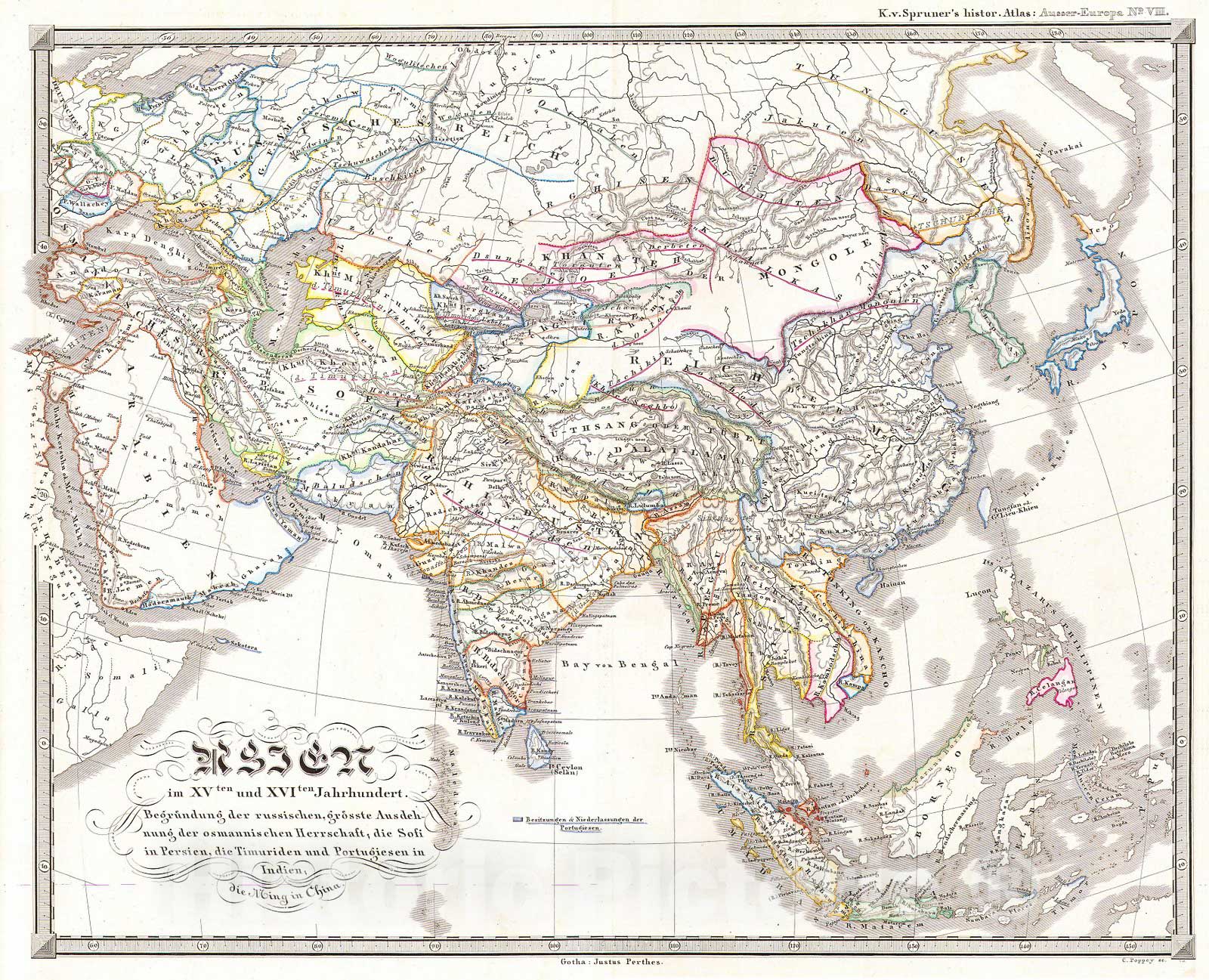 This fascinating hand colored map depicts Asia in the 15th and 16th centuries. This period roughly corresponds to the Ming Dyansty in China, the incursions of Persia and Portugal in India, and the beginning of the Russian Expansion. The Timur dynasty ruled Persia. Singapur (Singapor) is labeled. All text is in German. Issued in the 1870 edition of Stieler's Hand Atlas.