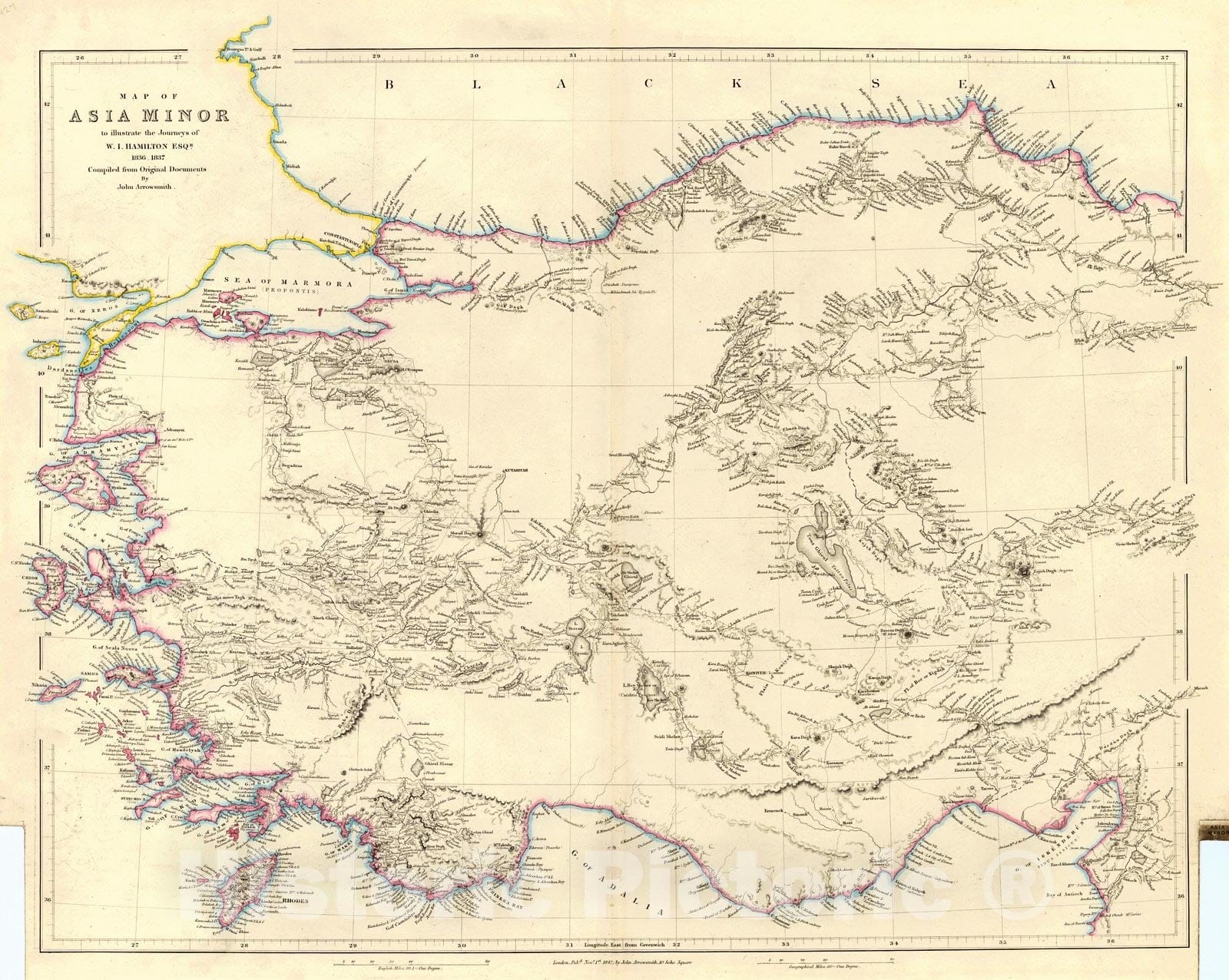 • .Historic Map : 1842 Map of Asia Minor to Illustrate the Journeys of W.I. Hamilton Esqr. 1835-1837 : Vintage Wall Art