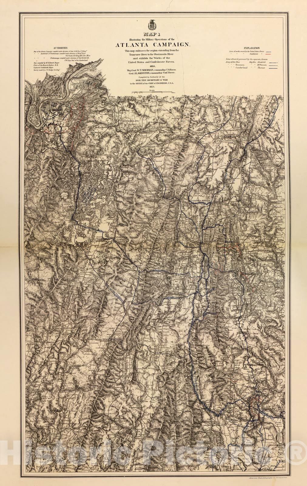 • Historic 1879 Map - Military maps. - Atlanta Campaign, Including Tennessee River to The Oostanaula River Region