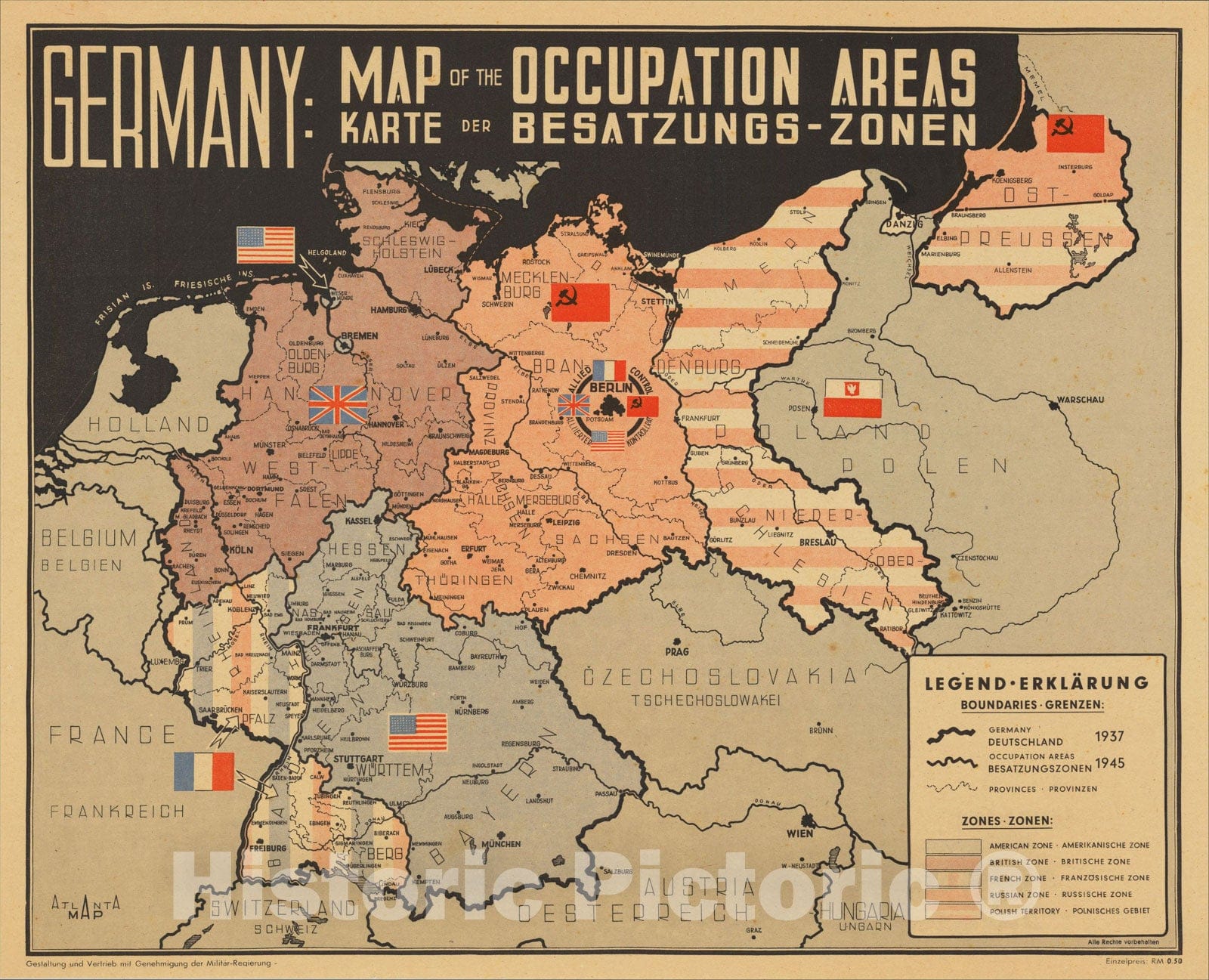 Historic Map : Germany: Map of the Occupation Areas - Karte Der Besatzungs-Zonen, 1945, Atlanta Map, Vintage Wall Art