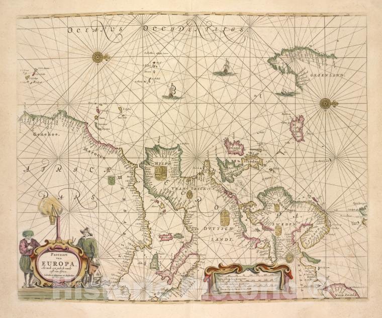 • .Historic 1672 Map - Pascaart Van Europa. - Europe - Atlantic Ocean - De Zee-Atlas Ofte Water-Wereld - Vintage Wall Art