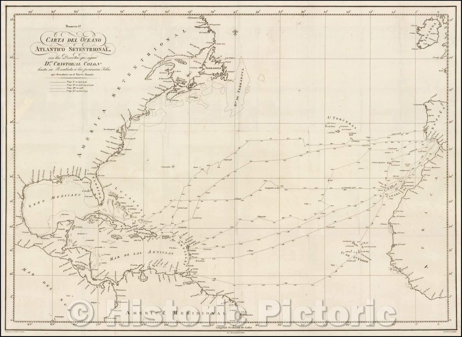 Historic Map - Carta del Oceano Atlantico Setentrional, con las Derrotas que sigui?Chart of the Atlantic, route of Christopher Columbus, Atlantic, 1825 - Vintage Wall Art