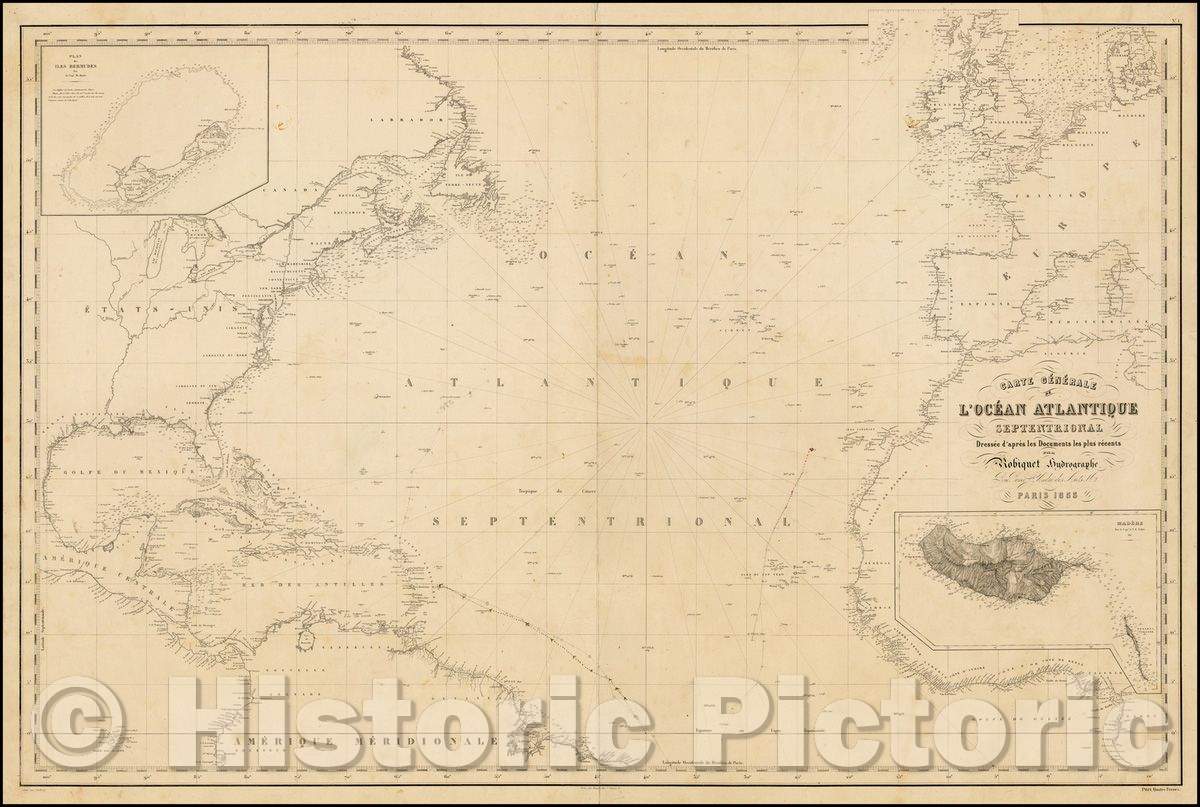 Historic Map - Carte Generale de L'Ocean Atlantique Septentrionale Dressee d'apres/Sea Chart of the North Atlantic, published in Paris by Aime Robiquet, 1855 - Vintage Wall Art