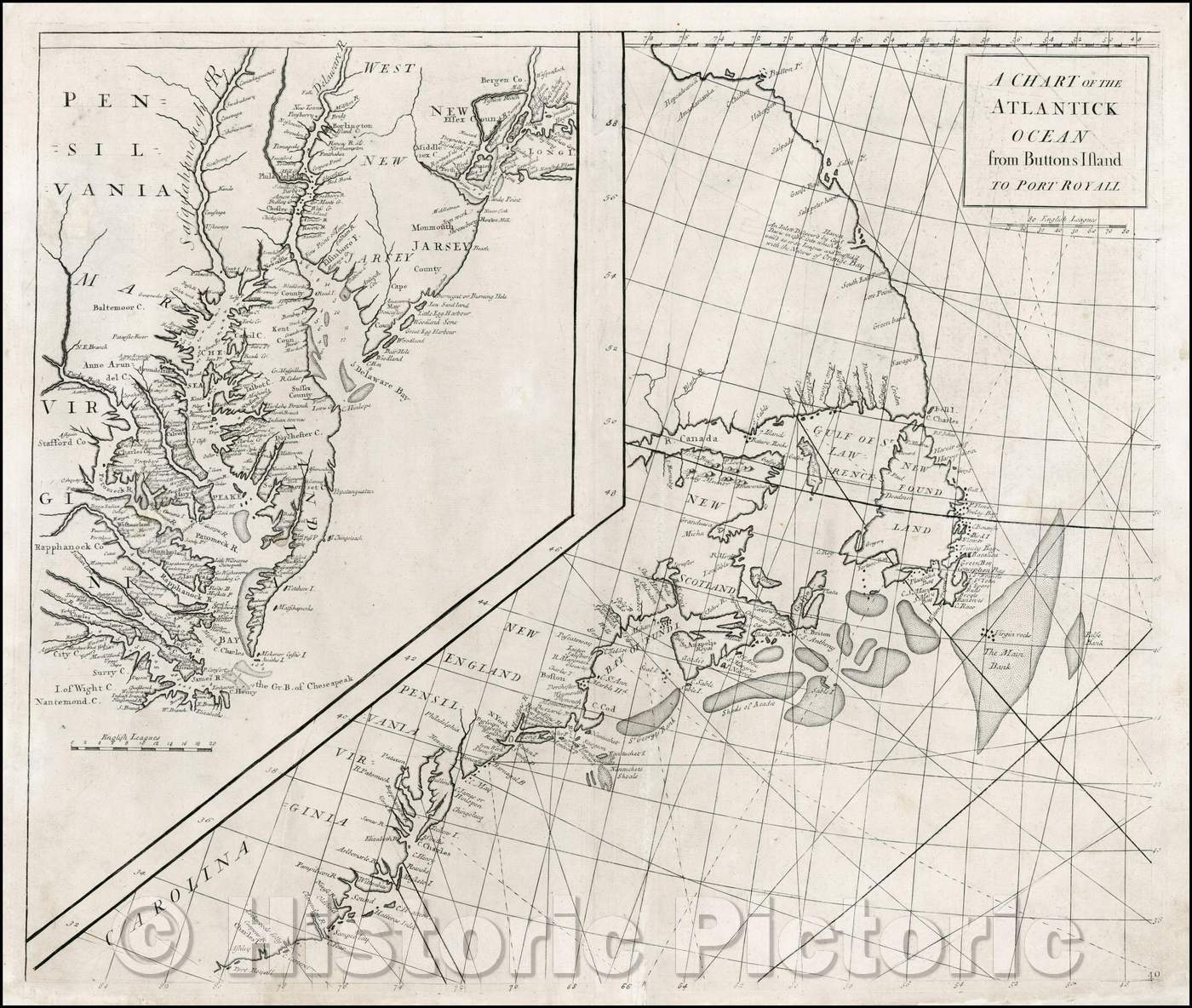 Historic Map - A Chart of the Atlantick Ocean from Buttons Island To Port Royall, Chesapeake Bay, Delaware Bay, New York City and Vicinity, 1728 - Vintage Wall Art