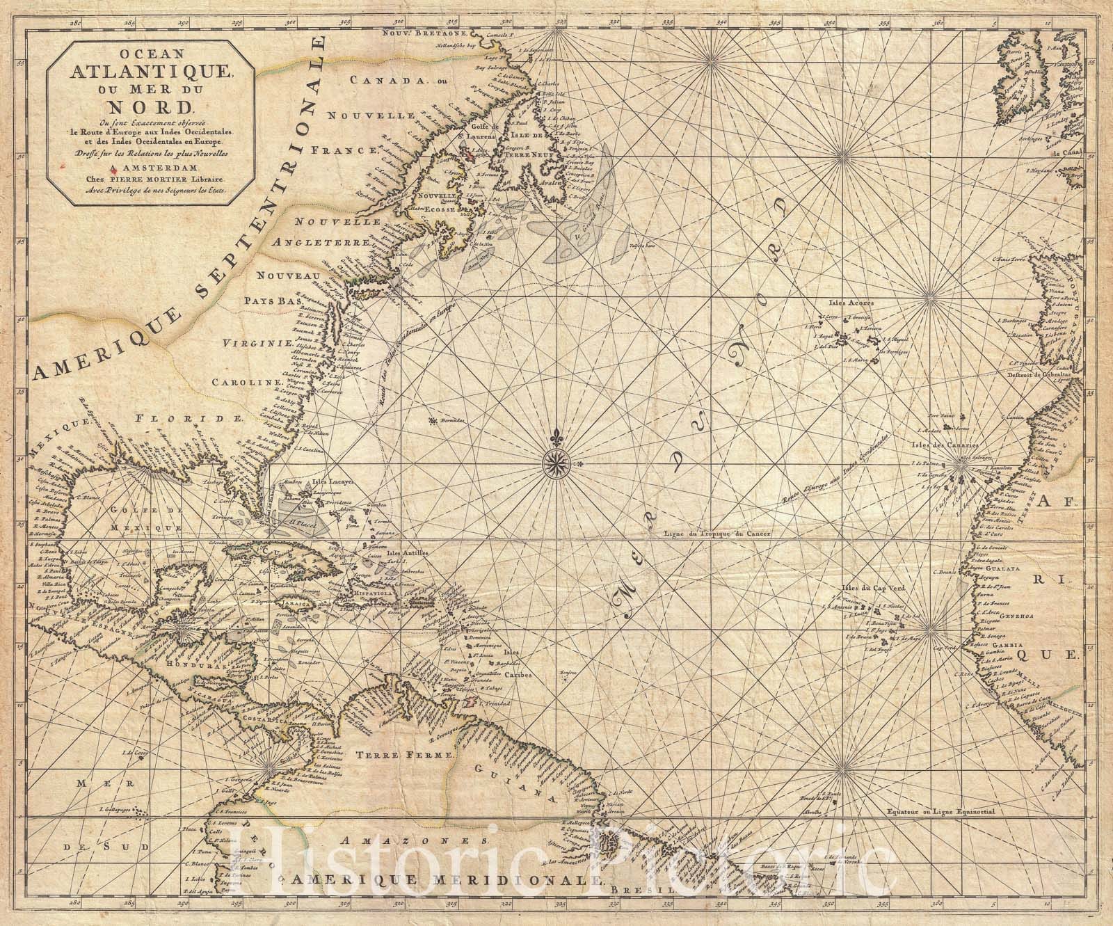 • .Historic Map : Mortier Map of North America, The West Indies, and The Atlantic Ocean , 1683, Vintage Wall Art
