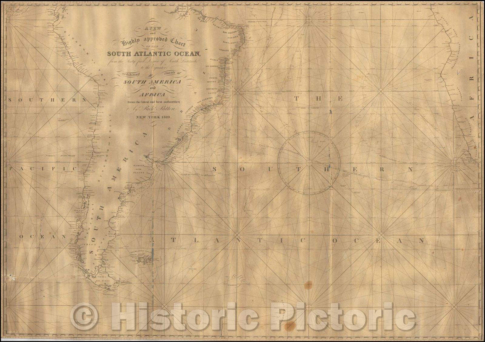 Historic Map - A New and Highly approved Chart of the South Atlantic Ocean from the Sixty first Degree of South Latitude to the Equator, 1819, Richard Patten - Vintage Wall Art