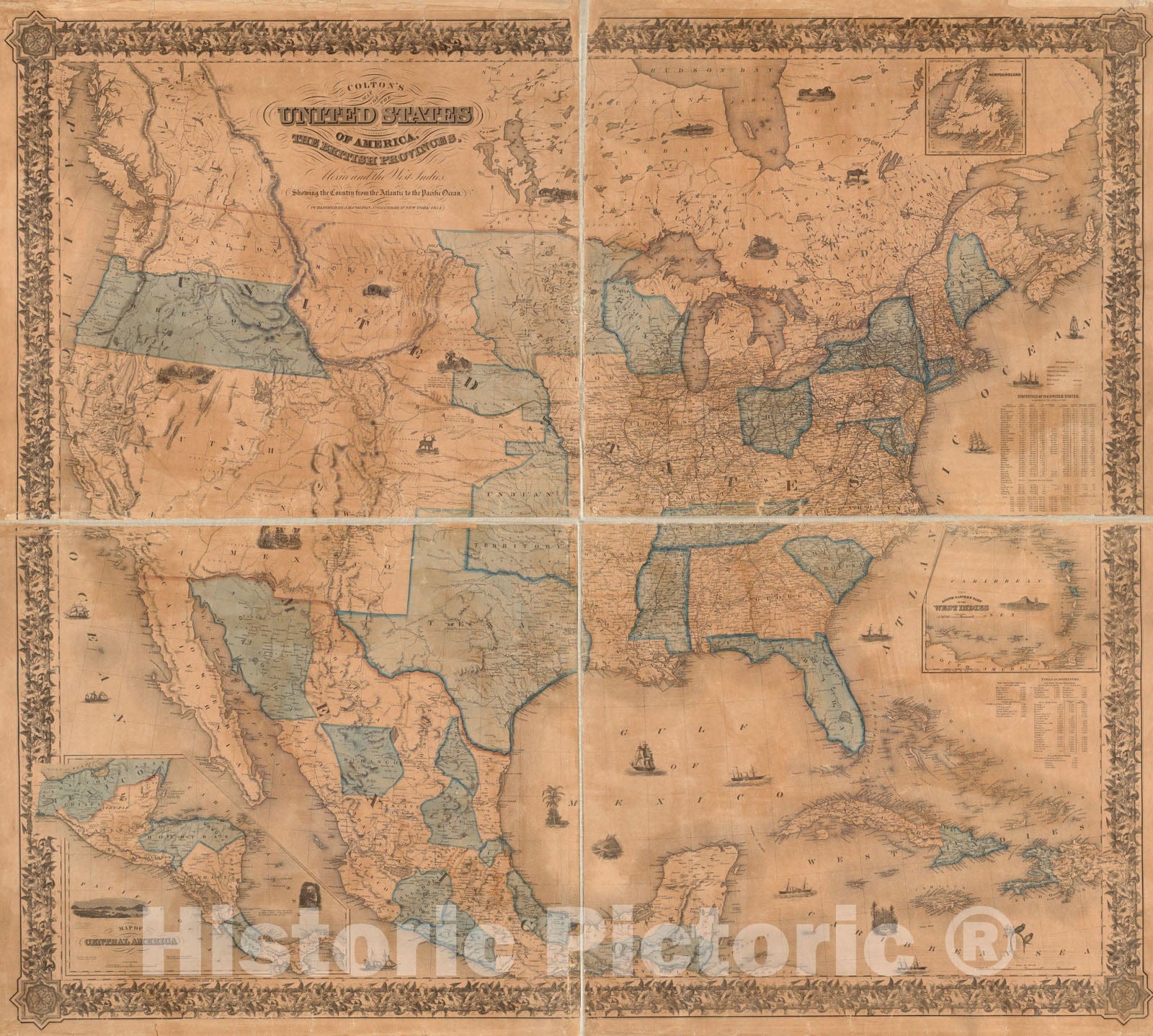 Historical Map, 1854 Colton's map of The United States of America, The British Provinces, Mexico and The West Indies : Showing The Country from The Atlantic to The Pacific Ocean Reprint