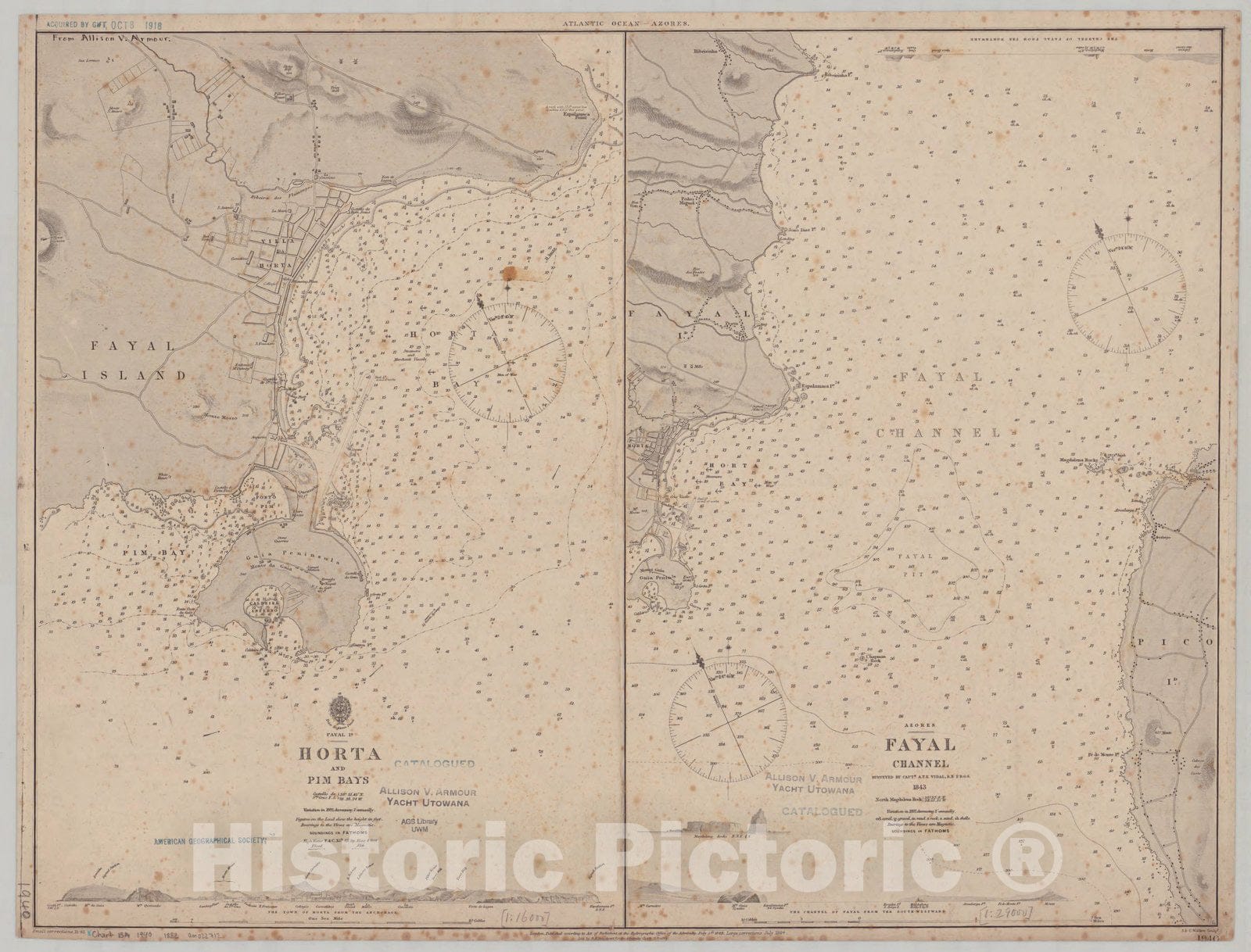 Map : Azores 1882, Atlantic Ocean, Azores, Fayal Id., Horta and Pim Bays, Azores, Fayal Channel , Antique Vintage Reproduction