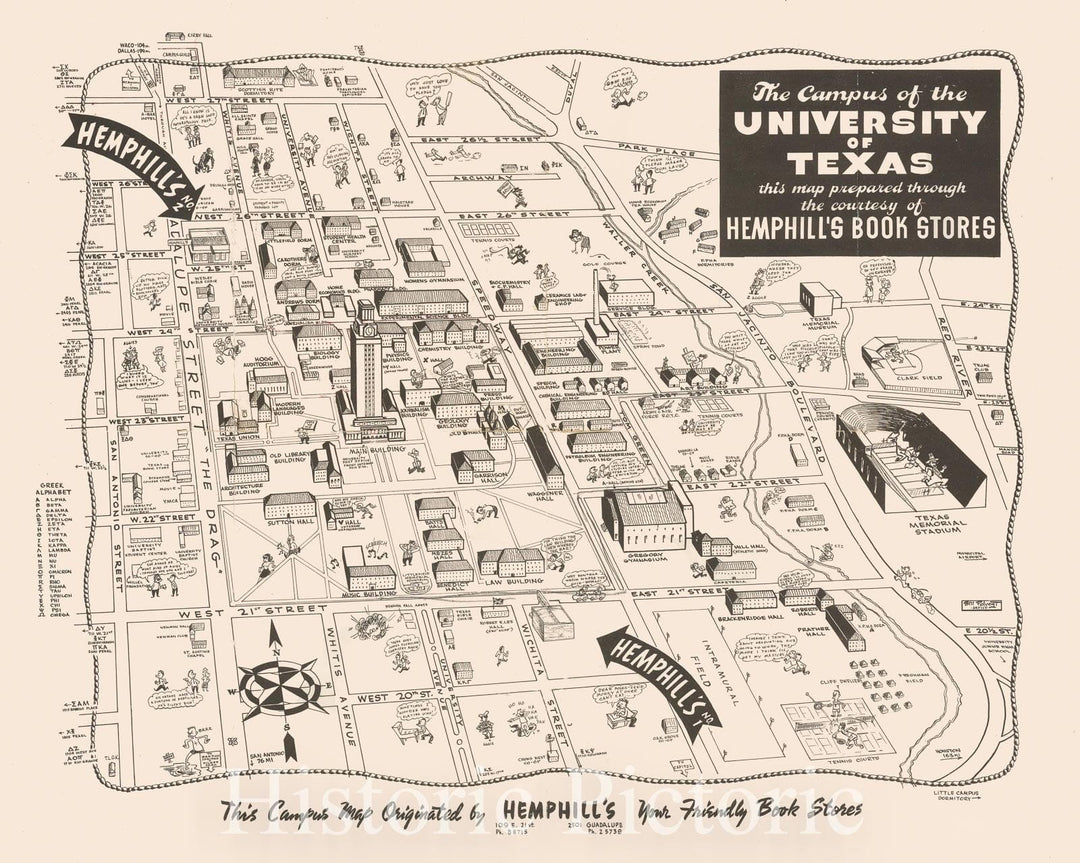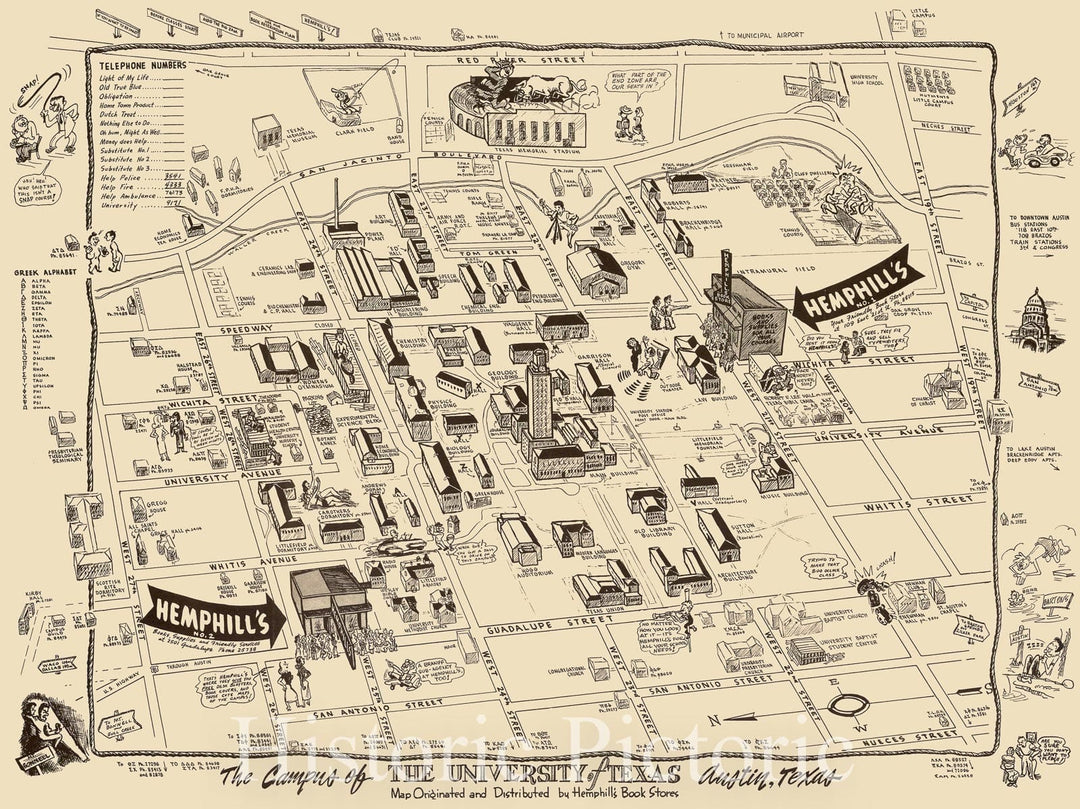 Historic Map - The Campus of The University of Texas. Austin, Texas. Map Originated and Distributed, 1945, Hemphill's Bookstore v1