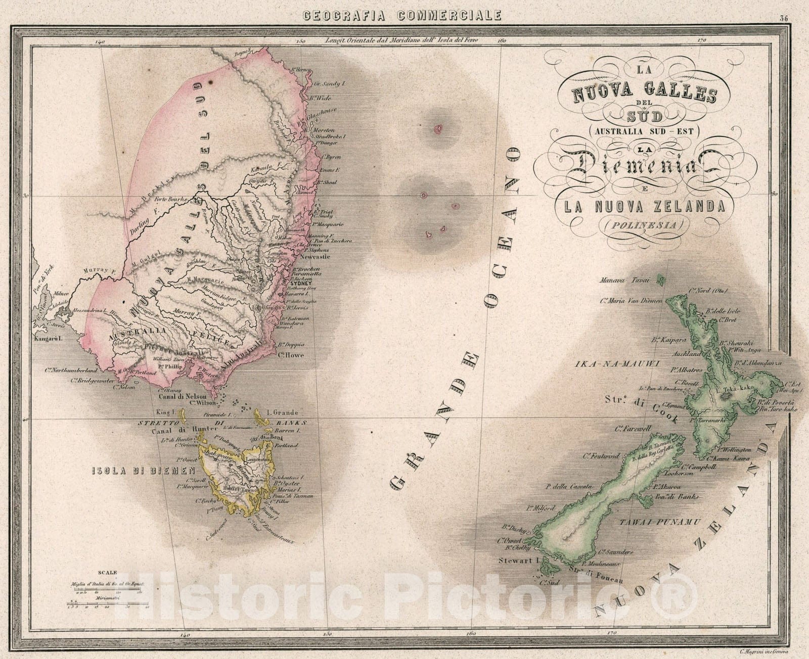 Historic Map : 36. La Nuova Galles del Sud (Australia Sud Est). La Diemenia e la Nuova Zelanda (Polinesia)., 1858, Vintage Wall Art