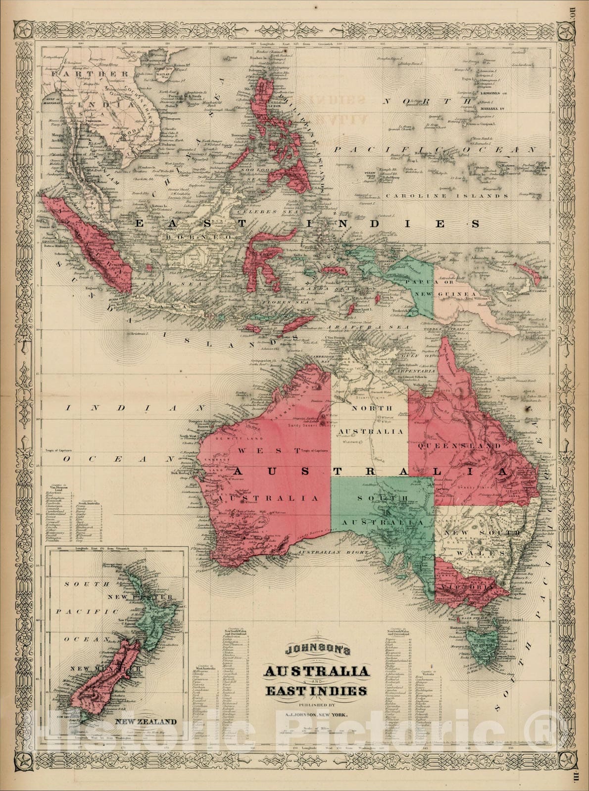 Historic Map : Johnson's Australia and East Indies [New Zealand inset], 1866, Alvin Jewett Johnson, Vintage Wall Art