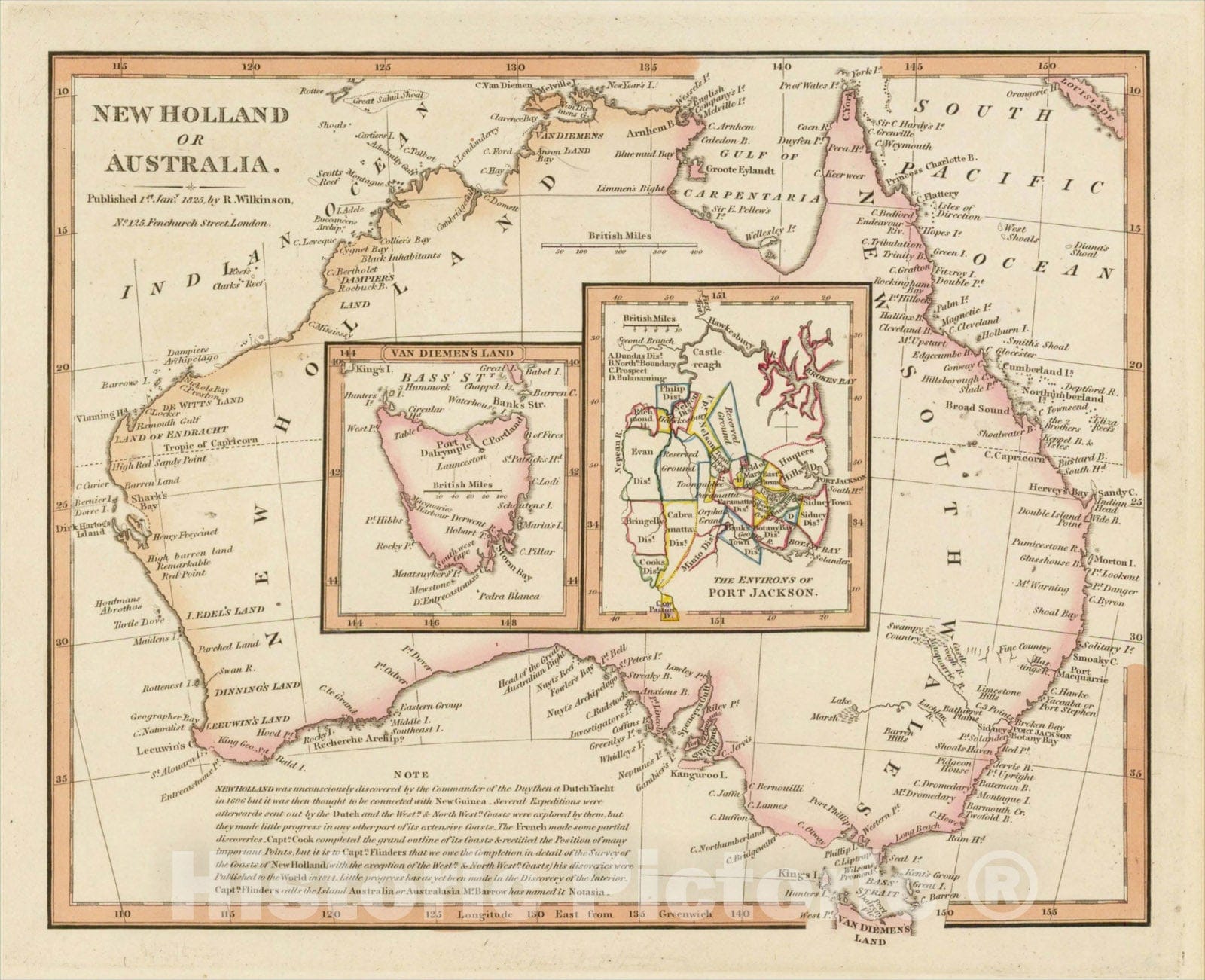 Historic Map : New Holland or Australia (inset Van Diemen's Land and The Environs of Port Jackson), 1825, Robert Wilkinson, Vintage Wall Art