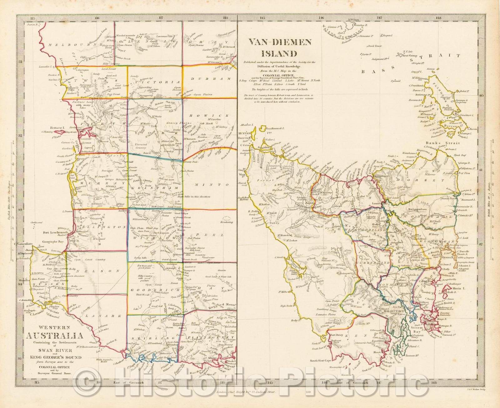 Historic Map - Western Australia containing the Settlements of Swan River and King George's Sound, 1849, SDUK - Vintage Wall Art