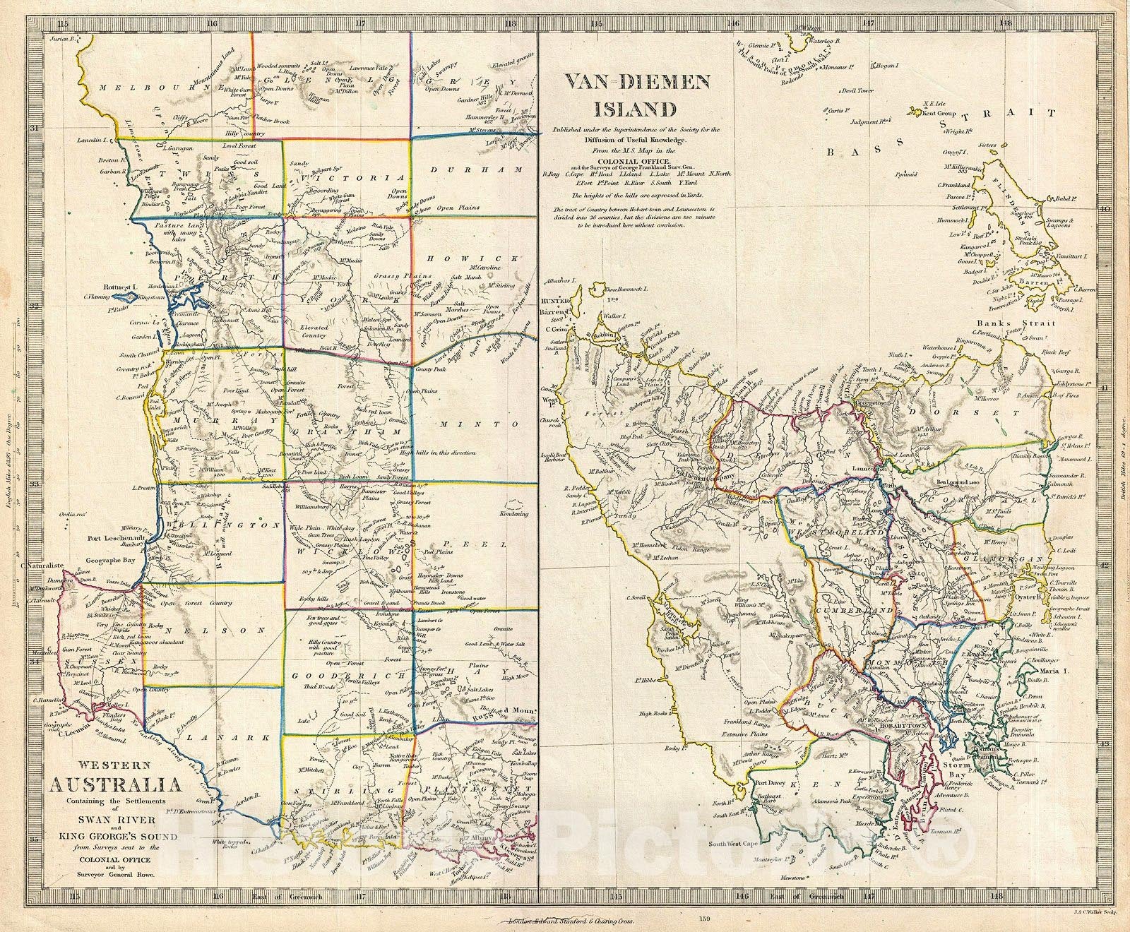 This is the c. 1849 Edward Stanford edition of the Society for the Diffusion of Useful Knowledge's historic map of Western Australia and Tasmania or Van Diemen's Land. Essentially two maps on one sheet. The leftmost map details western Australia from Melbourne south around Sussex to Stirling and Plantagenet. Notes numerous counties, roadways, geographical features, and more. The right hand map is a large detail of Van Diemen's Island or Tasmania. This map offers a significant update from previous editions in the addition of county detail to the Island. Names twelve counties as well as numerous geographical features, roadways, cities, and towns. Published by Edward Stanford of 6 Sharing Cross for the c. 1849 edition of the Maps of the S.D.U.K. atlas.