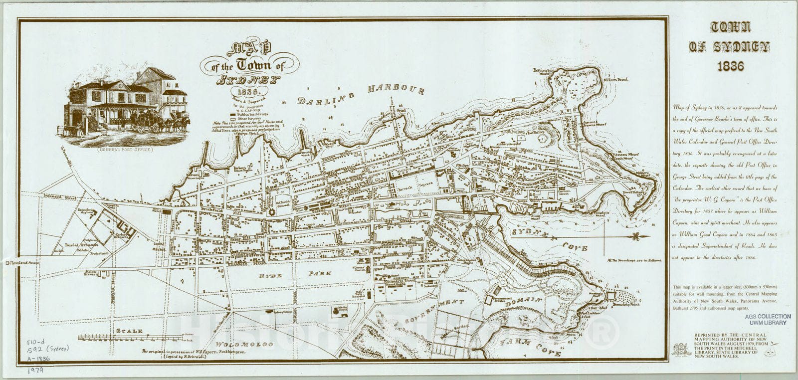 Map : Sydney, Australia 1836 1979, Town of Sydney, 1836 : map of the town of Sydney, 1836, Antique Vintage Reproduction