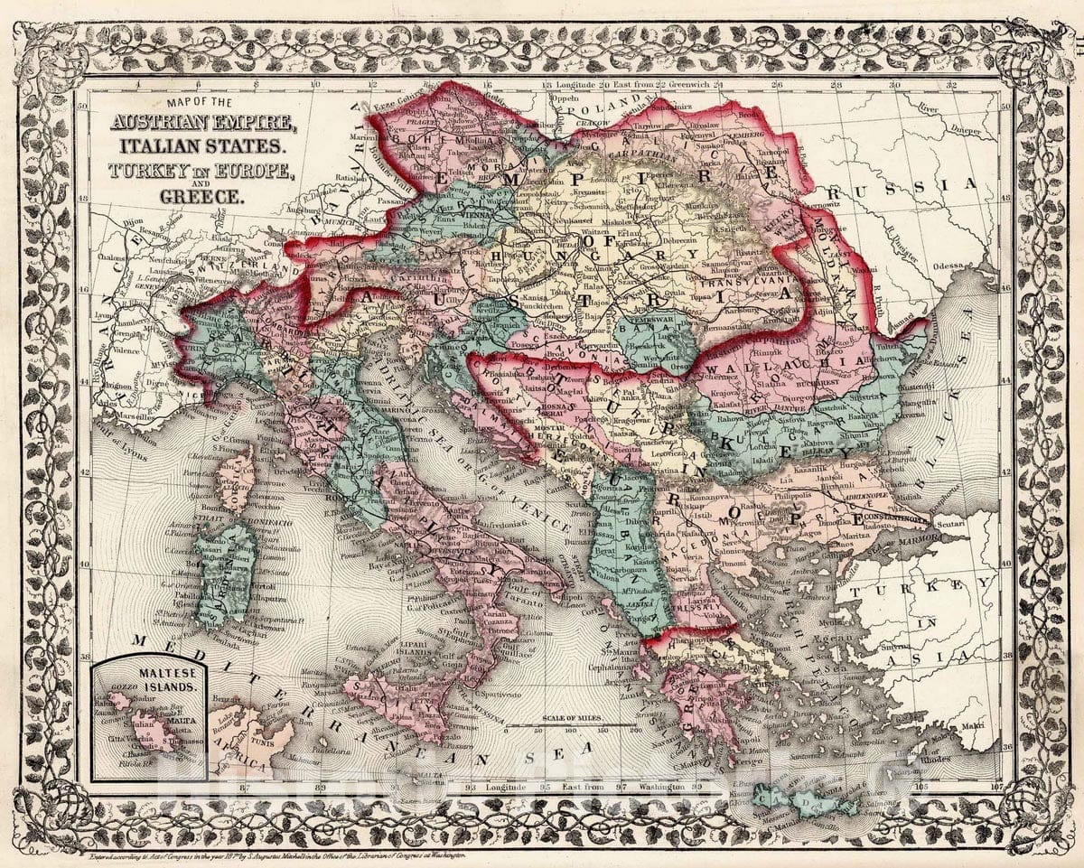 Historic Map : 1877 Map of Austrian Empire, Italian States. Turkey in Europe, and Greece - Vintage Wall Art