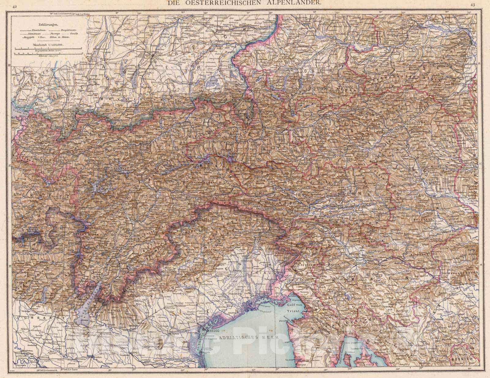 Historic Map : Austria; Italy, Alps, Europe 1881 Oesterreich. Alpenlander. , Vintage Wall Art