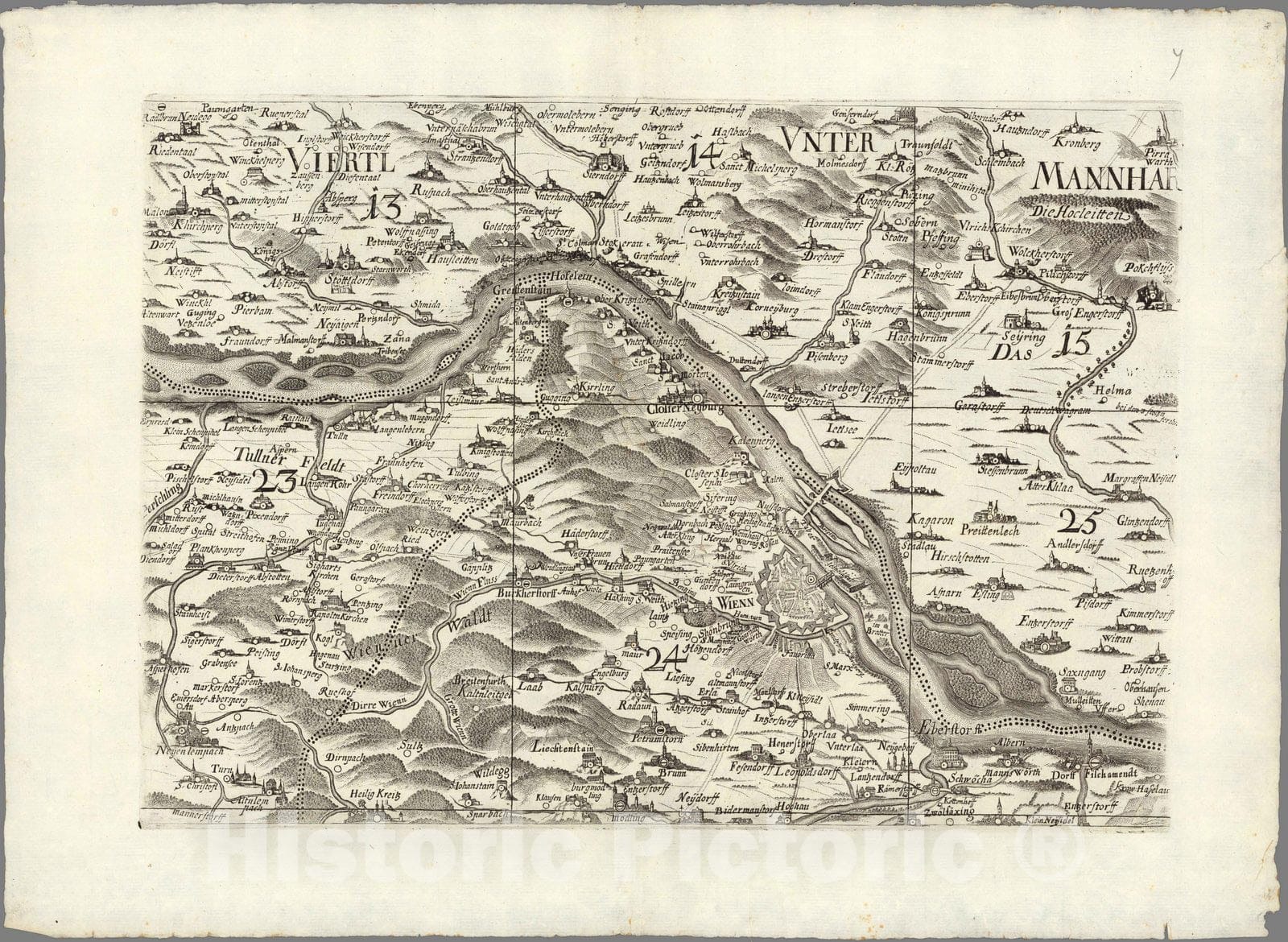 Historic Map : Austria, Topographic map of lower Austria by Georg Matthaus Vischer, 7. Archiducatus Austriae inferioris 1697 , Vintage Wall Art