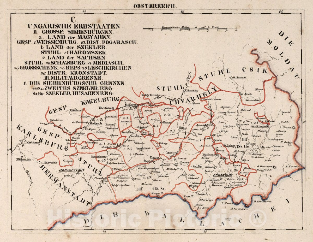 Historic Map : Austria, V.3:11-15:XII: 2. Oesterreich. C. Ungarische erbstaaten, II. Grossf: Siebenburgen. III. Militaergrenze, 1828 Atlas v1 , Vintage Wall Art