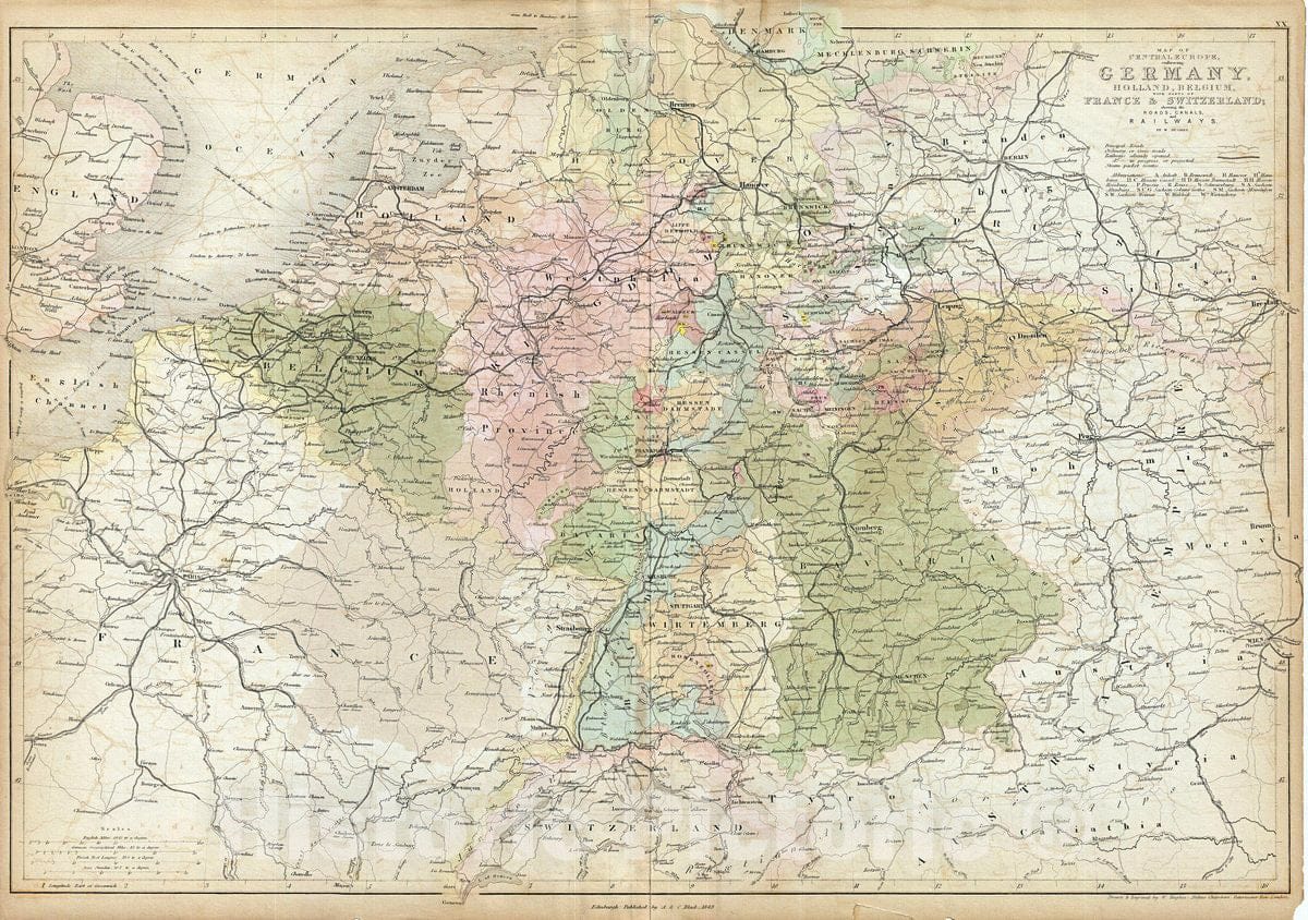 This is a fine example of Adam and Charles Black's 1851 map of central europe. The map covers from Hamburg to Lake Geneva, including the modern day countries of Germany, Netherlands, Belgium, France, Poland, the Czech Republic and Austria.