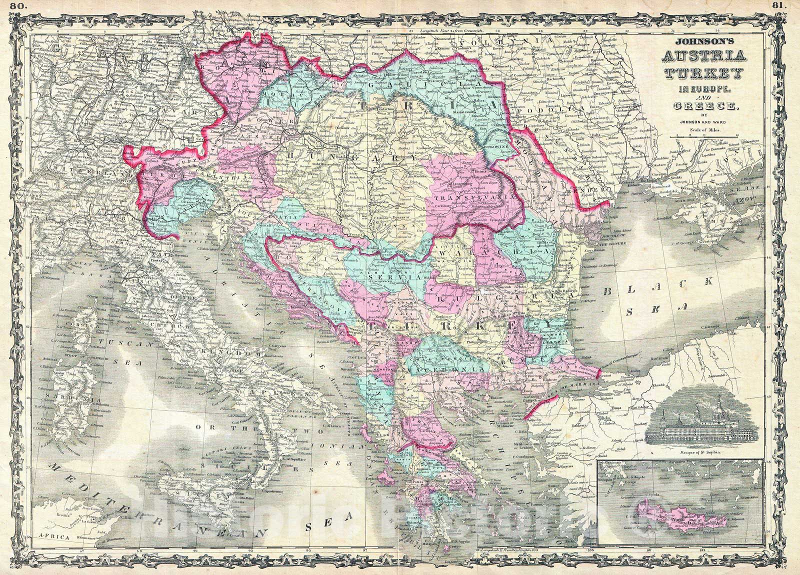 This is A. J. Johnson and Ward's 1863 map of Austria, Turkey in Europe and Greece. Covers from Italy eastward to include all of Austria, Hungary, the Balkans (Bosnia, Serbia, Albania, Croatia, Macedonia, Bulgaria, Rumania, etc.), Greece and parts of Turkey. Color coded by district. Shows major roadways, cities, rivers, trains and ferry crossings. Lower right quadrant offers a view of the Mosque of St. Sophia in Istanbul. Features the strapwork border common to Johnson's atlas work from 1860 to 1863. Steel plate engraving prepared by A. J. Johnson for publication as page nos. 85-86 in the 1863 edition of his New Illustrated Atlas… This is the first edition of the Johnson's Atlas to bear the Johnson and Ward imprint.