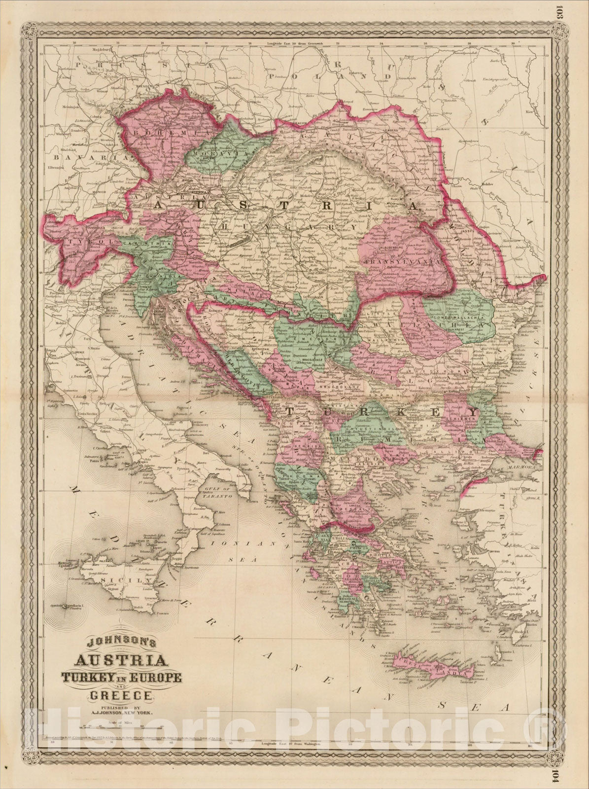 Historic Map : Johnson's Austria Turkey in Europe and Greece, 1871, Alvin Jewett Johnson, Vintage Wall Art