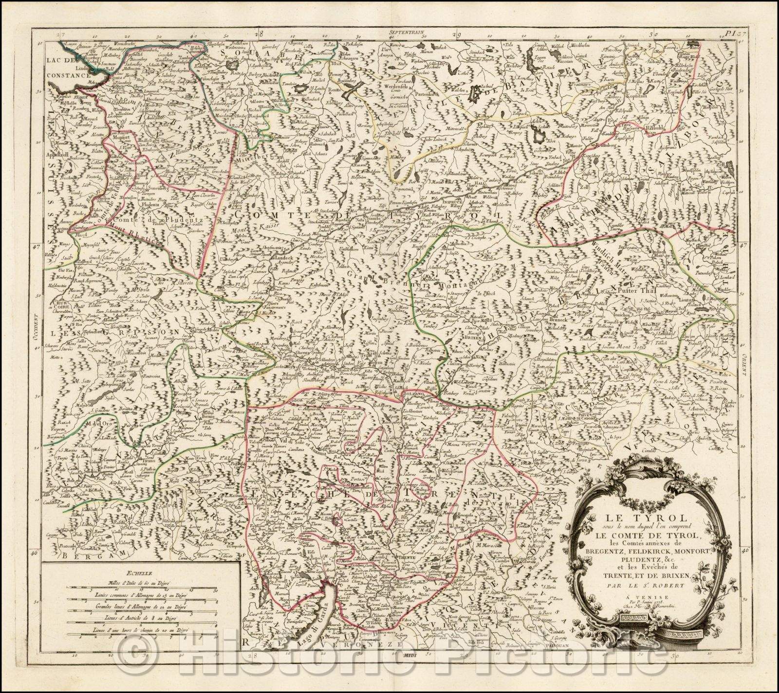 • .Historic Map - Le Tyrol sous le nom duquel l'on comprend Le Comte Tyrol, les Comtes annexes de Bregentz :: Regional of northeastern Italy and southern Austria, 1778 - Vintage Wall Art
