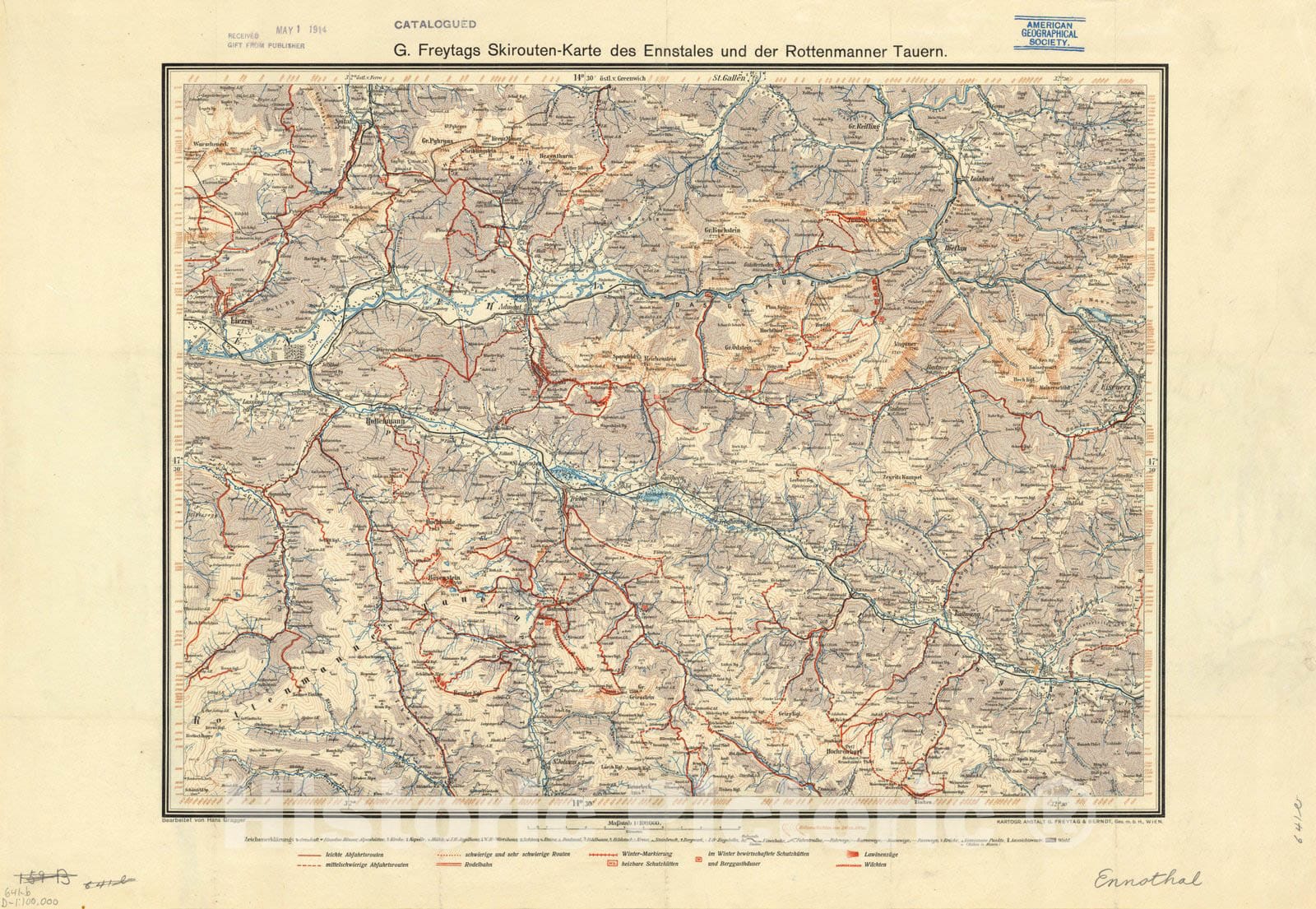 Map : Ennstales und der Rottenmanner Tauern, Austria 1913, G. Freytags Skirouten-Karte des Ennstales und der Rottenmanner Tauern, Antique Vintage Reproduction