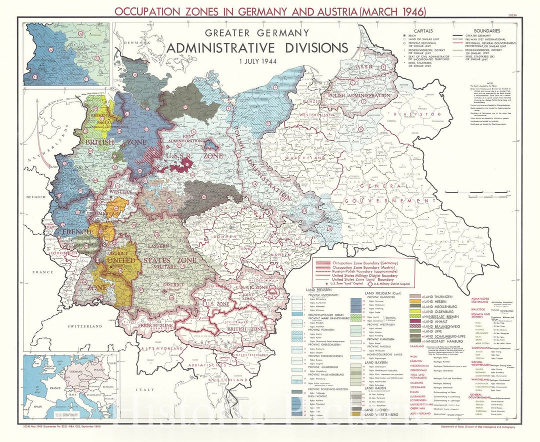 Historic Map : Germany and Austria 1946, Occupation zones in Germany and Austria (March 1946) : Greater Germany Administrative Divisions 1 July 1944 , Antique Vintage Reproduction