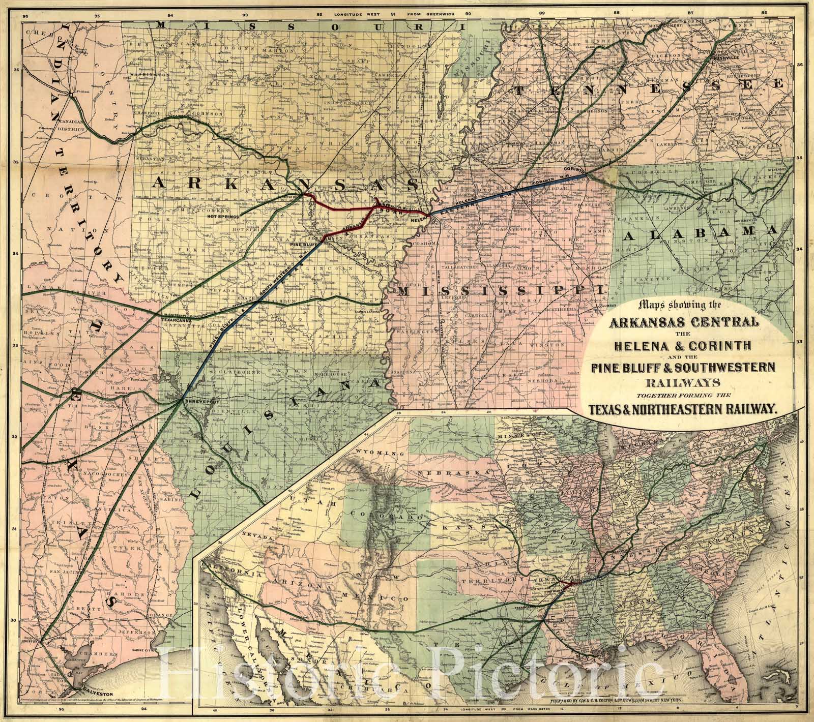 Historic 1872 Map - Maps Showing Arkansas Central, The Helena & Corinth, and The Pine Bluff & Southwestern Railroads Together Forming The Texas & Northeastern Railway.