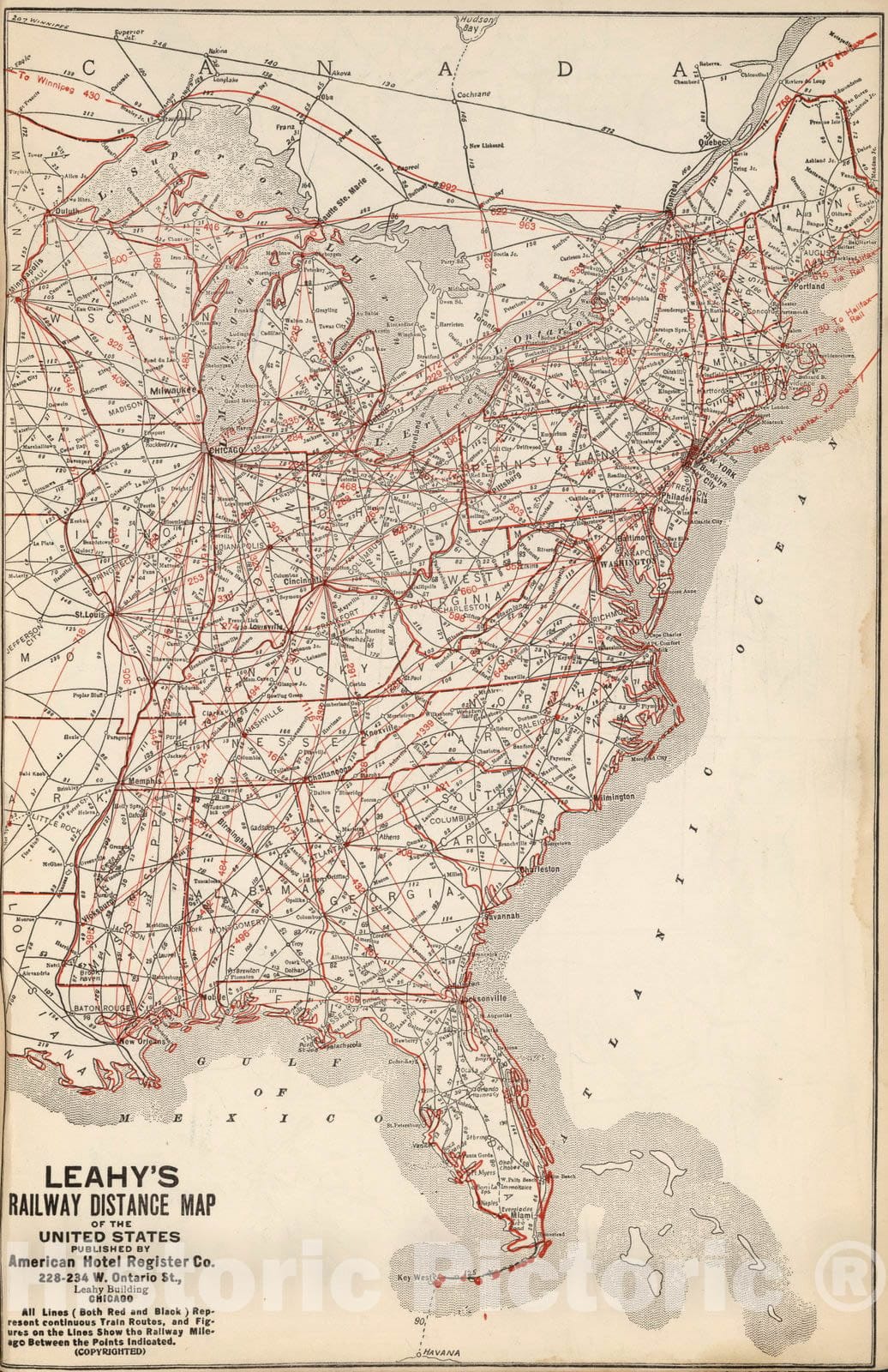 Leahy's Railway Distance Map of the United States. Published by American Hotel Register Company. Leahy Building 228-234 W. Ontario street, Chicago. (Copyrighted). | Leahy's Hotel Guide and Railway Distance Maps of America. The Green book, It Shows the Way. Published by American Hotel Register Company. Leahy Building 228-234 W. Ontario street, Chicago, Ill. Established Nearly Half Century. Revised Edition No. 59, Copyrighted Jan. 1934. Price of this book, complete $5.00. Subscription, Five Years .... $20.00, Combined Guide and Map of any Individual State 25 cents. | A guide to accompany the revised edition No. 59 of Leahy's Hotel Guide and Railway Distance Maps of America. It lists the Hotels of the town with the number of rooms of each, their rates per day and the population of the town. It includes the name of the railroads entering the town and where the town can be found on the map. Maps of each state are opposite the State lists of towns and hotels making it easy and convenient to refer from the one to the other. The maps give the railroad distance between towns. The Guide includes the Provinces of Canada, as well as the United States. The railroad distance maps of Europe, Mexico, South and Central America ... Maps printed without color, Railroad lines shown in red on some maps. The Guidebook is bound in Green paper covers with title in gold: Leahy's Hotel Guide and R.R. Distance Maps. Southern Pacific Lines.