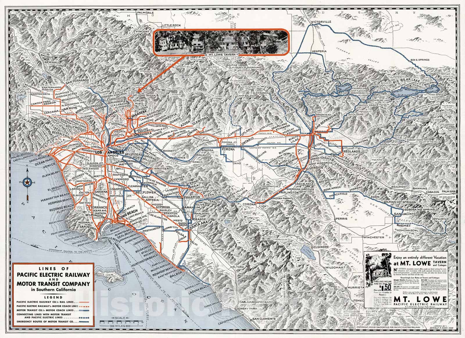 Historic Map : Lines of Pacific Electric Railway and Motor Transit Company in Southern California (with View of Mt. Lowe Tavern), 1935, Vintage Wall Art