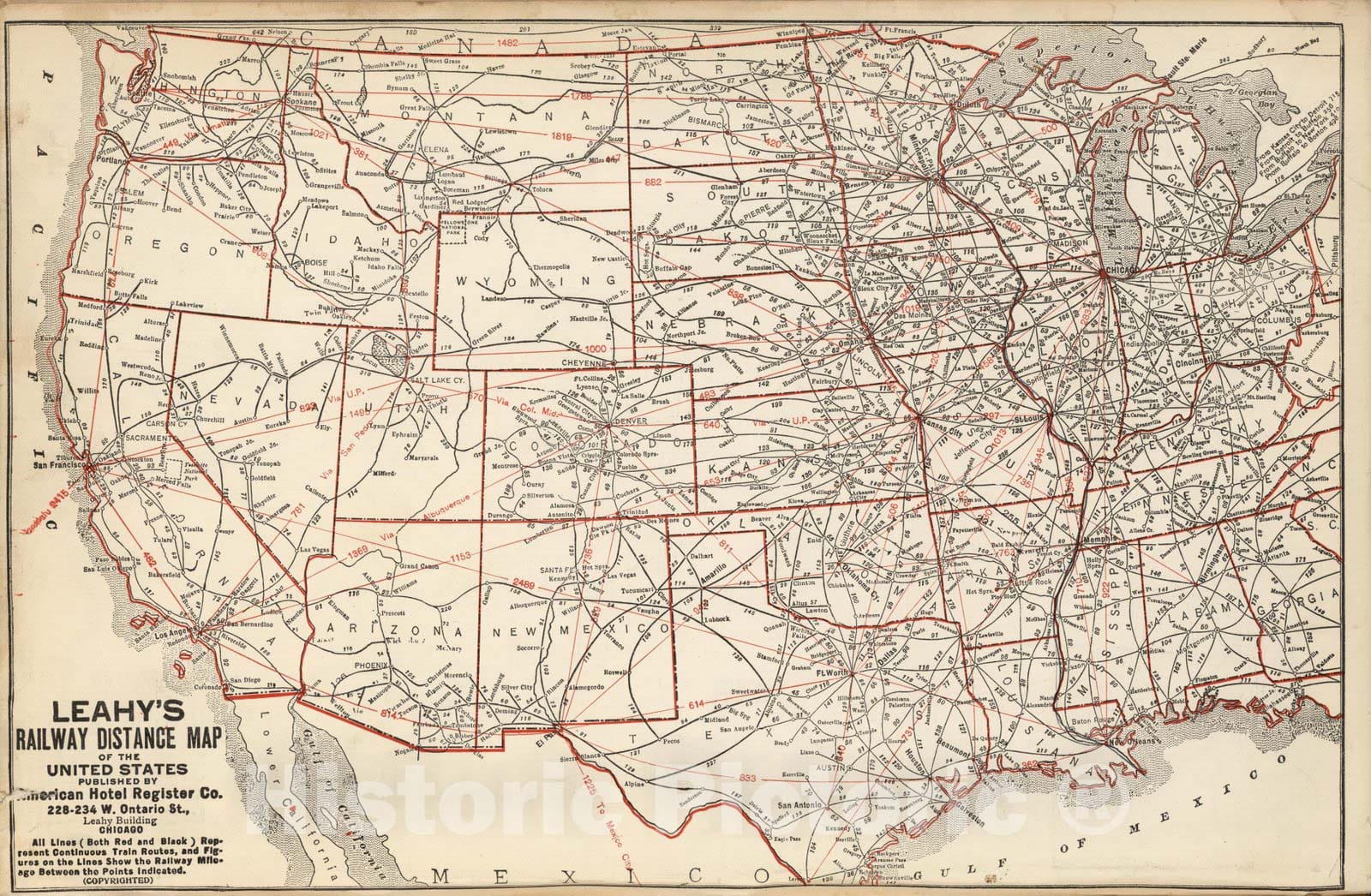 Leahy's Railway Distance Map of the United States. Published by American Hotel Register Company. Leahy Building 228-234 W. Ontario street, Chicago. (Copyrighted). | Leahy's Hotel Guide and Railway Distance Maps of America. The Green book, It Shows the Way. Published by American Hotel Register Company. Leahy Building 228-234 W. Ontario street, Chicago, Ill. Established Nearly Half Century. Revised Edition No. 59, Copyrighted Jan. 1934. Price of this book, complete $5.00. Subscription, Five Years .... $20.00, Combined Guide and Map of any Individual State 25 cents. | A guide to accompany the revised edition No. 59 of Leahy's Hotel Guide and Railway Distance Maps of America. It lists the Hotels of the town with the number of rooms of each, their rates per day and the population of the town. It includes the name of the railroads entering the town and where the town can be found on the map. Maps of each state are opposite the State lists of towns and hotels making it easy and convenient to refer from the one to the other. The maps give the railroad distance between towns. The Guide includes the Provinces of Canada, as well as the United States. The railroad distance maps of Europe, Mexico, South and Central America ... Maps printed without color, Railroad lines shown in red on some maps. The Guidebook is bound in Green paper covers with title in gold: Leahy's Hotel Guide and R.R. Distance Maps. Southern Pacific Lines.