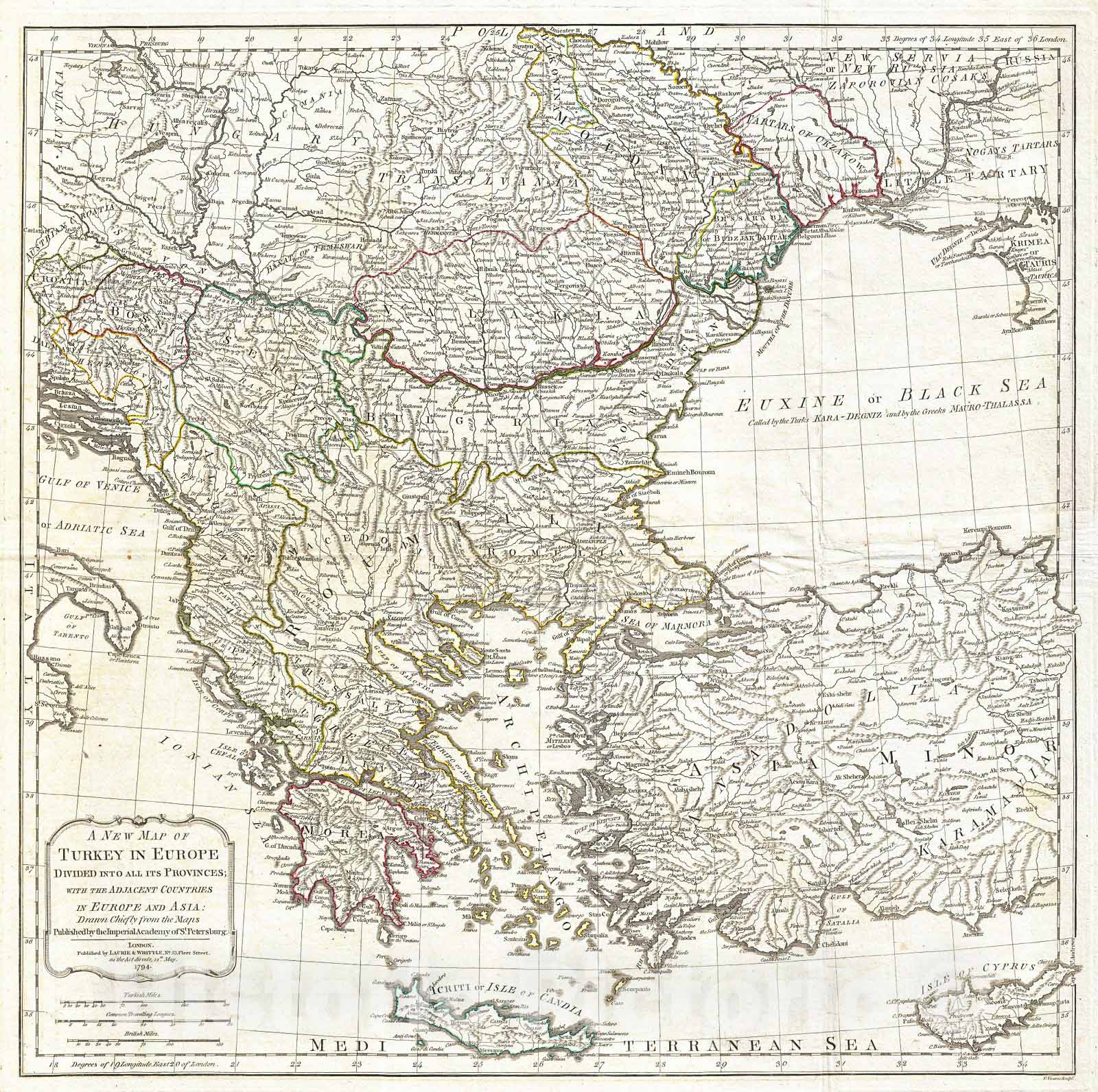 An extraordinary large format 1794 map of Greece, Turkey in Europe, the Balkans and adjacent regions by Laurie and Whittle. Map covers from the Gulf of Taranto, Italy, eastward as far as the Crimea, extend northwards to Transylvania and Moldova and southwards as far as Crete and Cyprus. Includes the modern day nations of Greece, Turkey, Cyprus, Bosnia, Croatia, Albania, Serbia, Macedonia, Bulgaria, Hungary, Rumania, Bulgaria, Moldova, and parts of Italy, Austria and the Ukraine. Offers extraordinary detail throughout, noting cities, roads, geographical features, and sub-states. Based on survey work originally completed in 1789 by the Imperial Academy of Sciences in St. Petersburg. Prepared and published by Laurie and Whittle as plate no. 24 in the 1797 edition of Thomas Kitchin's General Atlas .