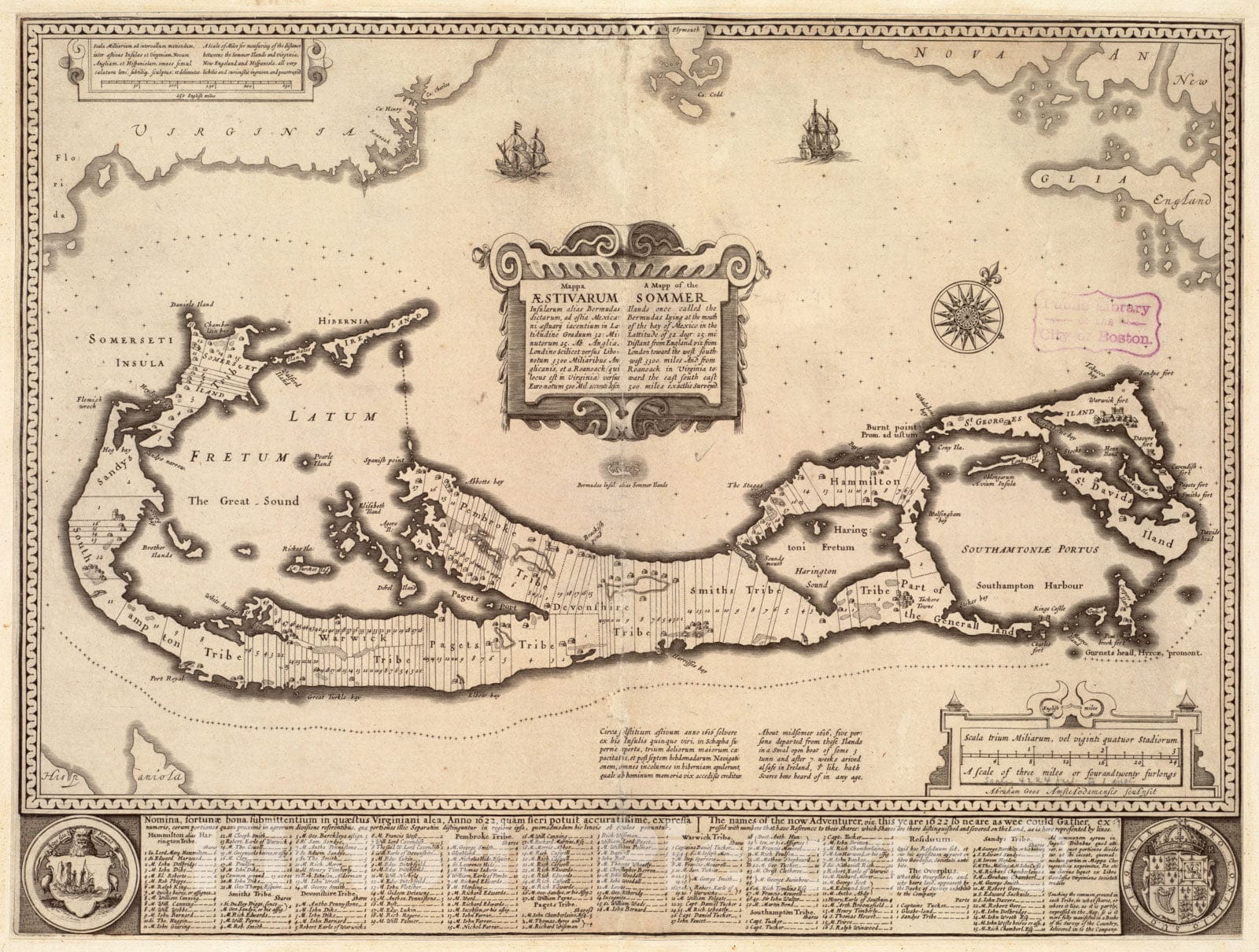 Historical Map, c.1626 Mappa astivarum insularum alias Bermudas dictarum ad ostia Mexicaniaccurate descr = A Mapp of the Sommer Islands once called the Bermudas, Vintage Wall Art