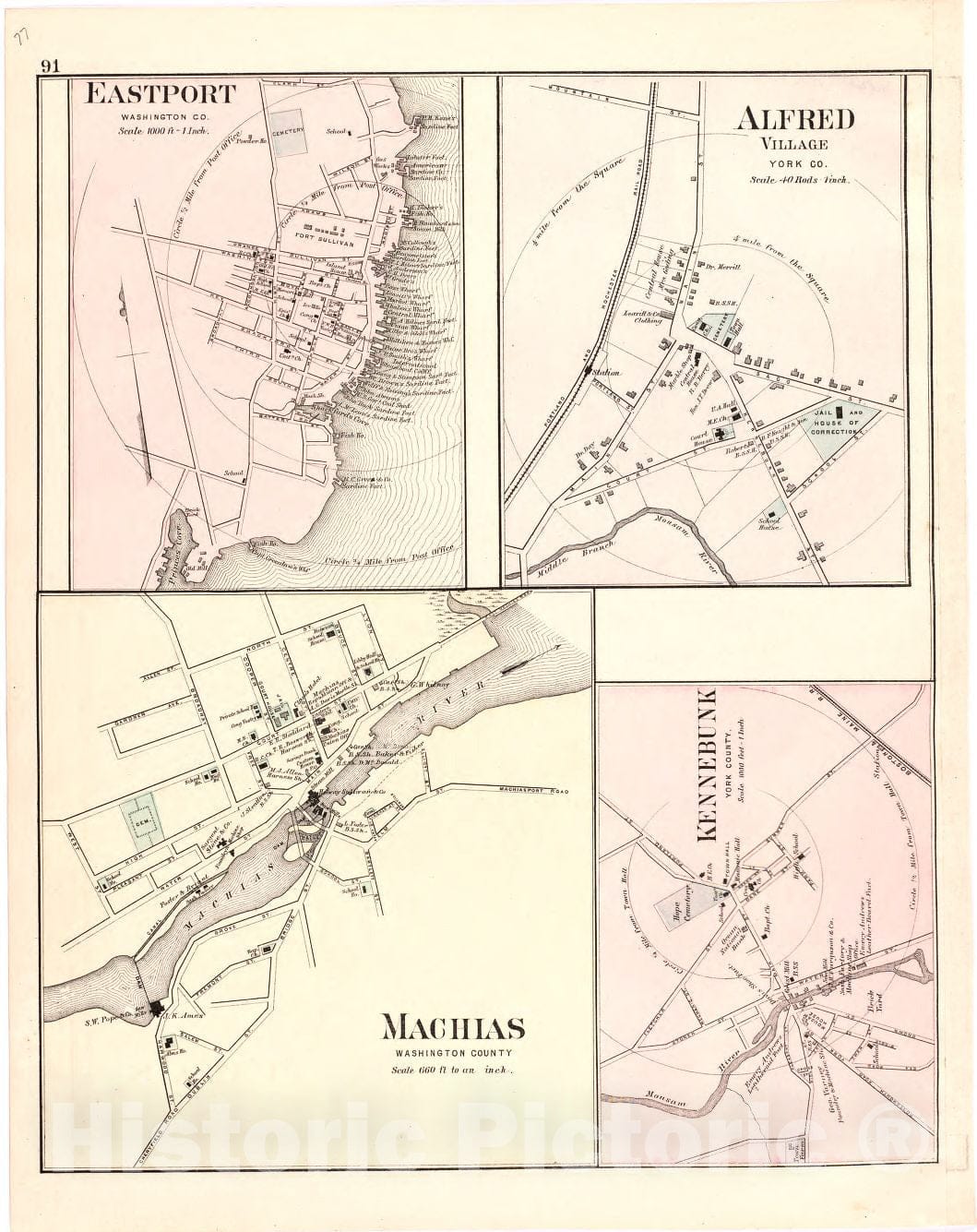 Historic 1887 Map - Colby's Atlas of The State of Maine - Eastport; Alfred Village; Machias; Kennebunk