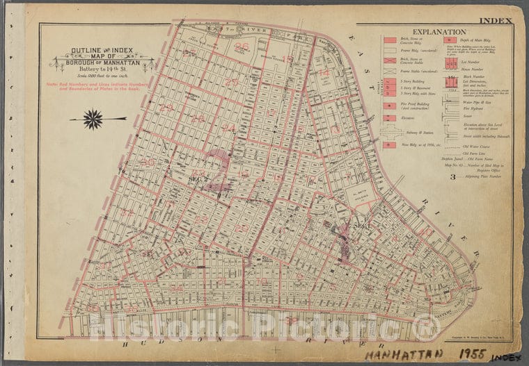 Historic 1955 Map - Outline And Index Map Of Borough Of Manhattan. Battery To 14Th S - Vintage Wall Art