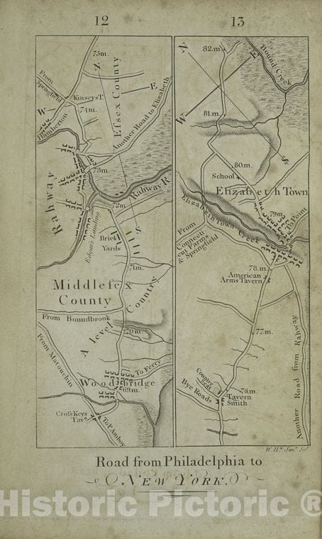 Historic Map - 1802 Philadelphia, Pennsylvania (Pa.), [Road From Philadelphia To New York, Seg. 12-13.] - Vintage Wall Art