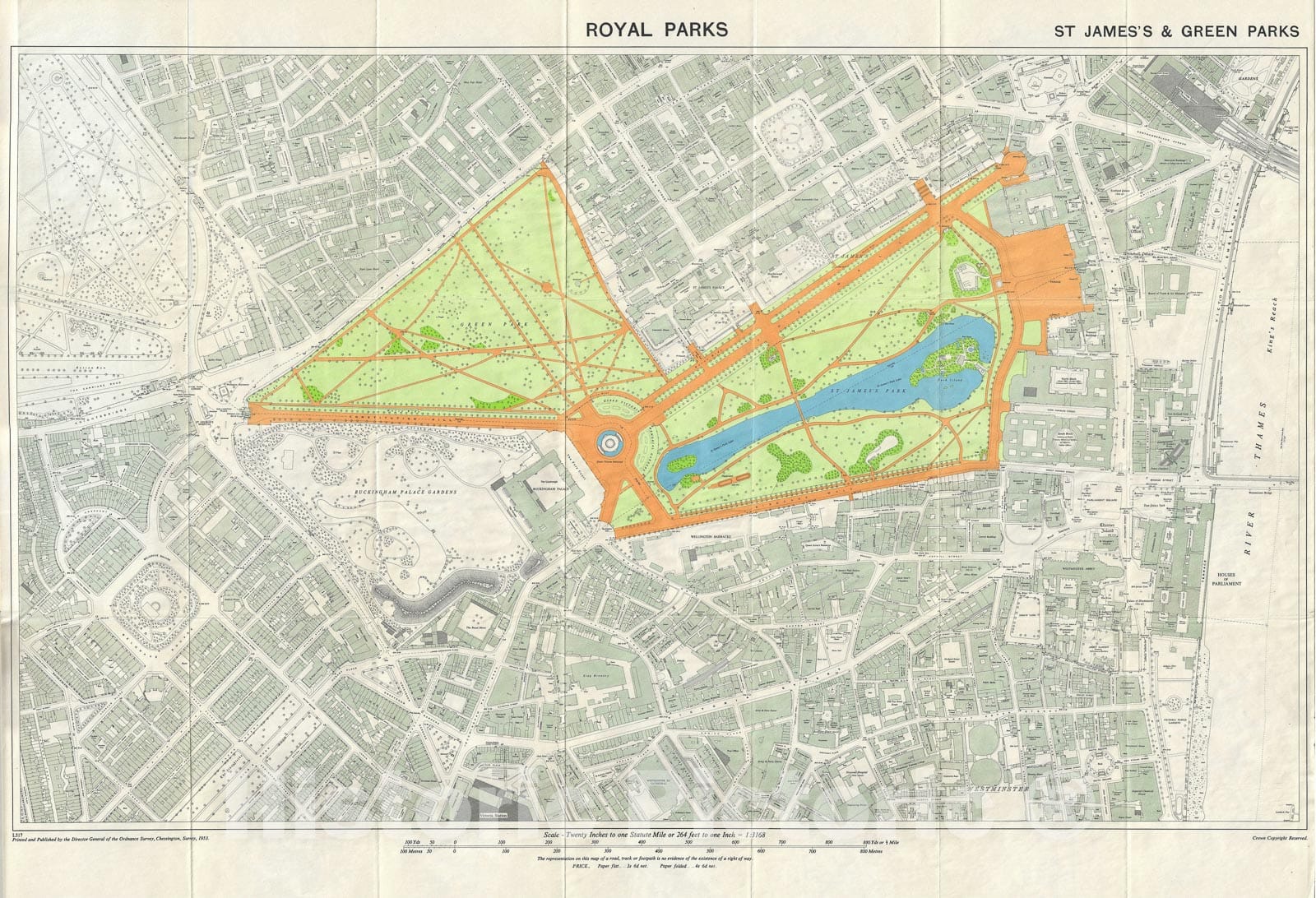 The St. James's and Green Parks "Royal Parks", London, England, Ordnance Survey, 1953