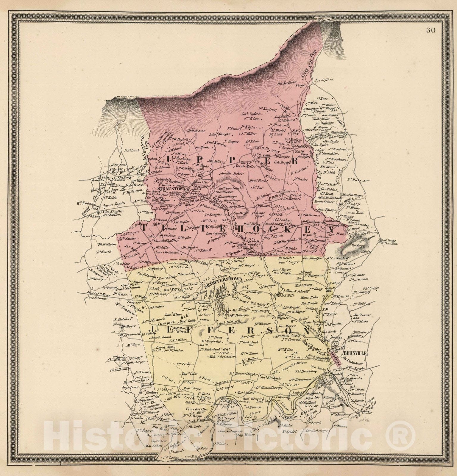 • .Historic Wall Map : 1862 Upper Tulpehocken and Jefferson Townships, Becks County, Pennsylvania. - Vintage Wall Art