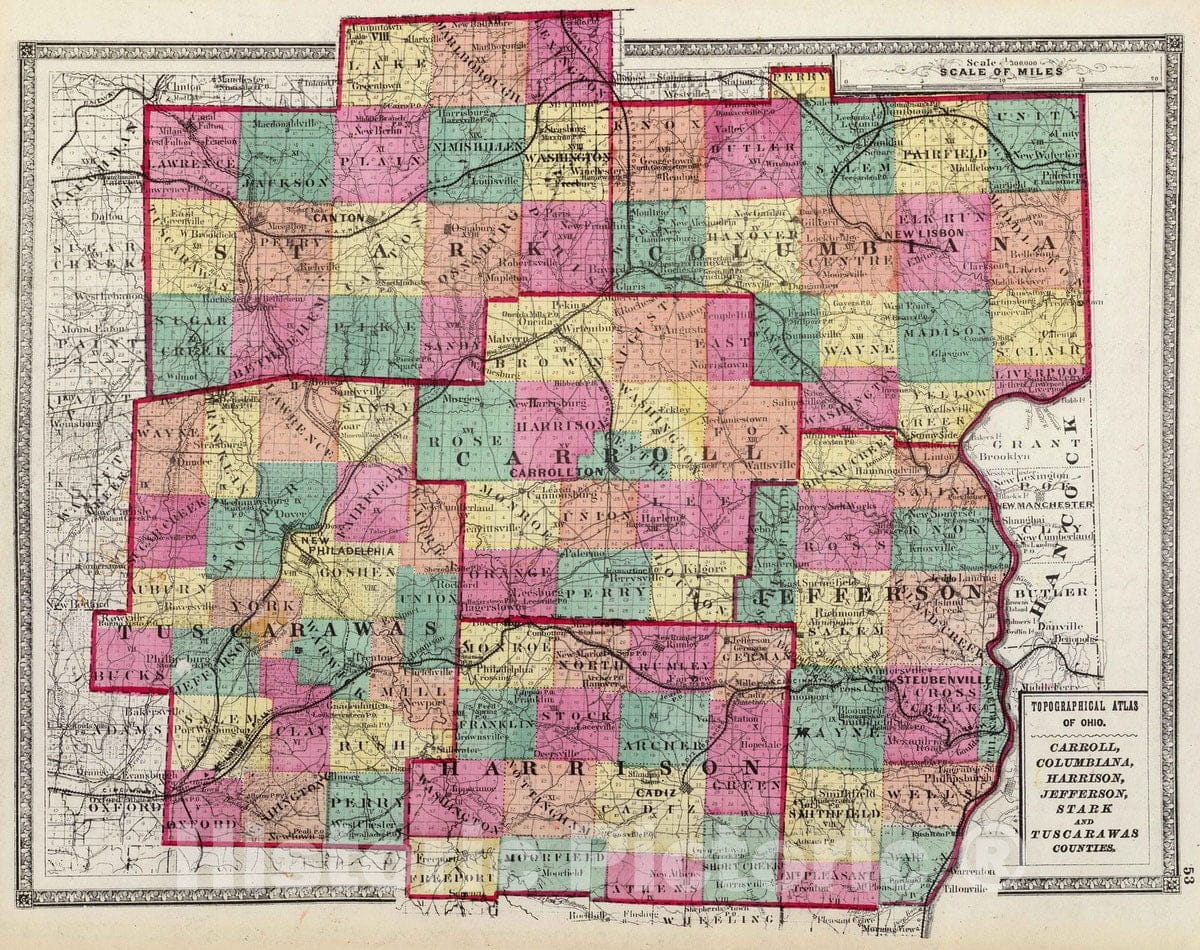 Historic Wall Map : 1872 Carroll, Columbiana, Harrison, Jefferson, Stark and Tuscarawas counties. - Vintage Wall Art