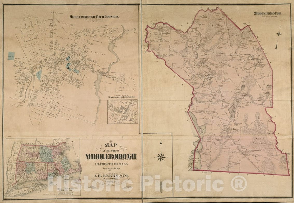 Historical Map, 1874 Map of The Town of Middleborough : Plymouth Co. Mass. : from Actual surveys, Vintage Wall Art