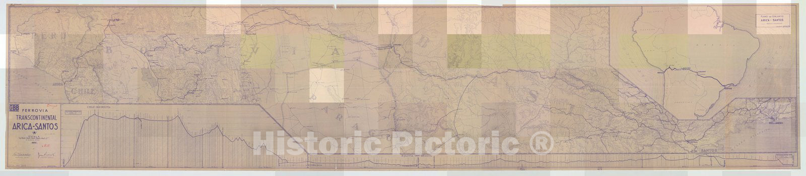 • .Map : Bolivia, Brazil and Chile 1941, Ferrovia Transcontinental Arica-Santos , Antique Vintage Reproduction