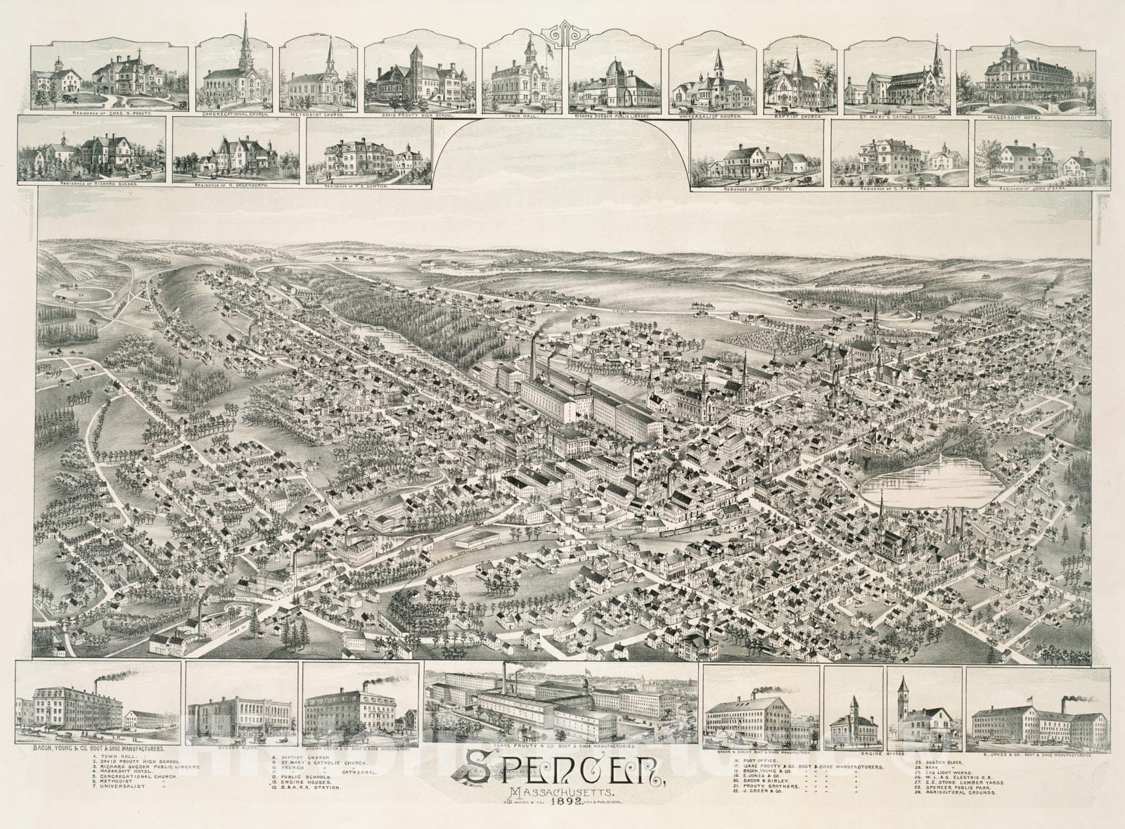 Historical Map, Spencer, Massachusetts, 1892, Vintage Wall Art