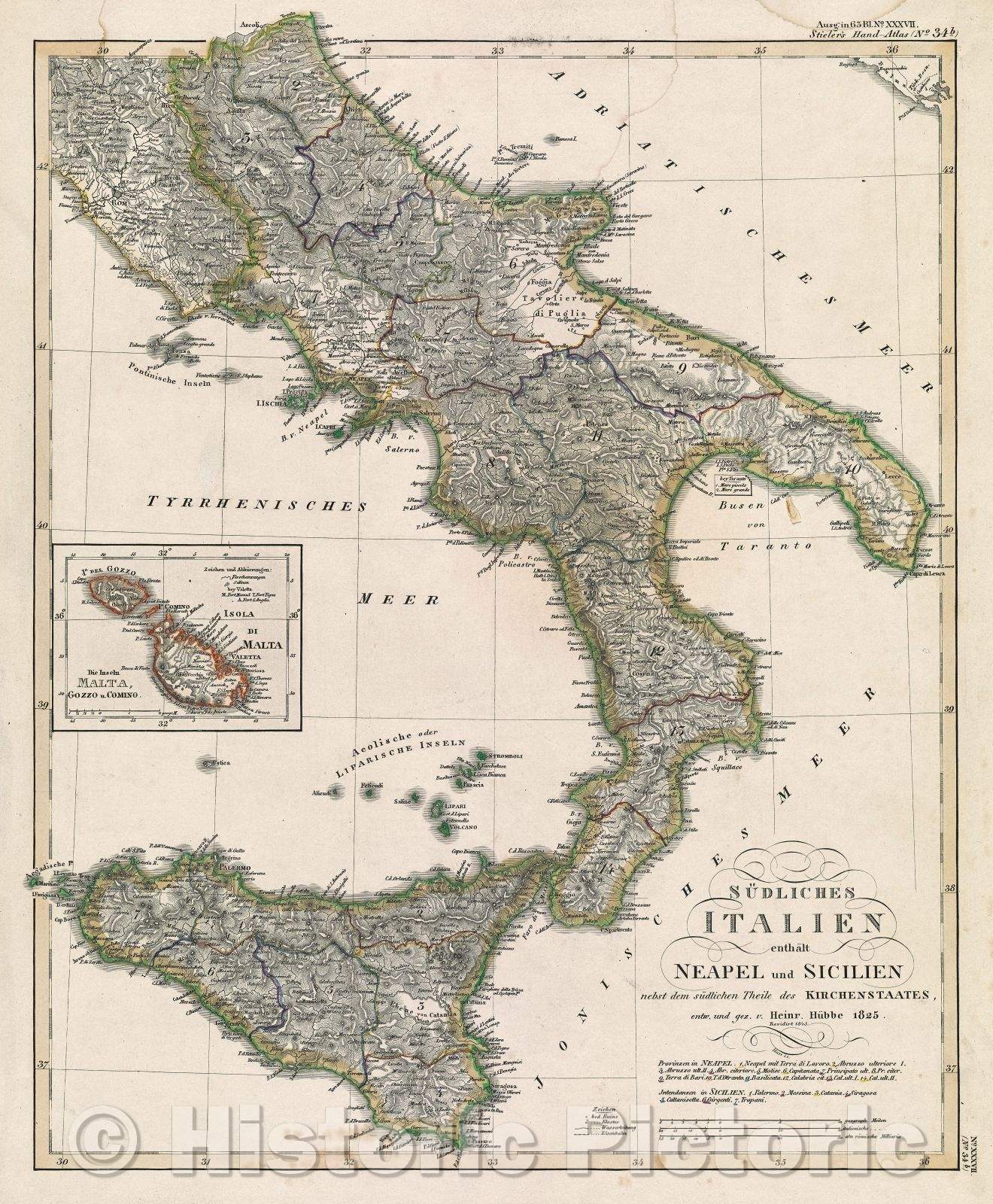 Historic Map : Su?dliches Italien : entha?lt Neapel und Sicilien nebst dem su?dlichen Theile des Kirchenstaats, 1845 , Vintage Wall Art